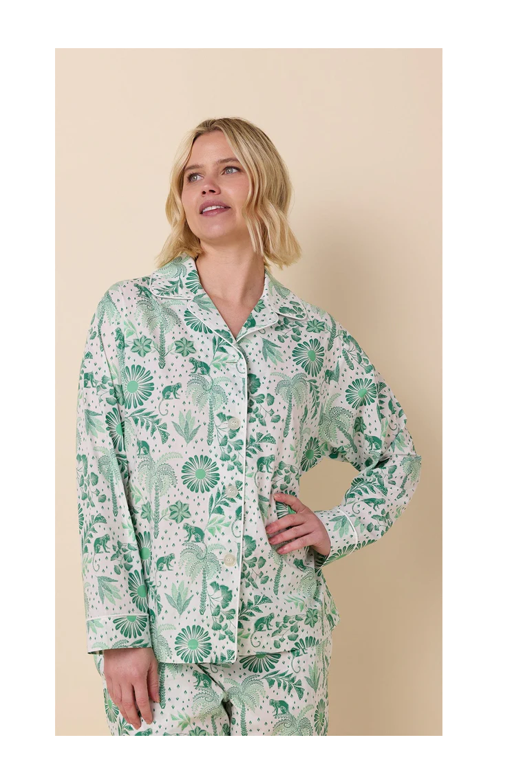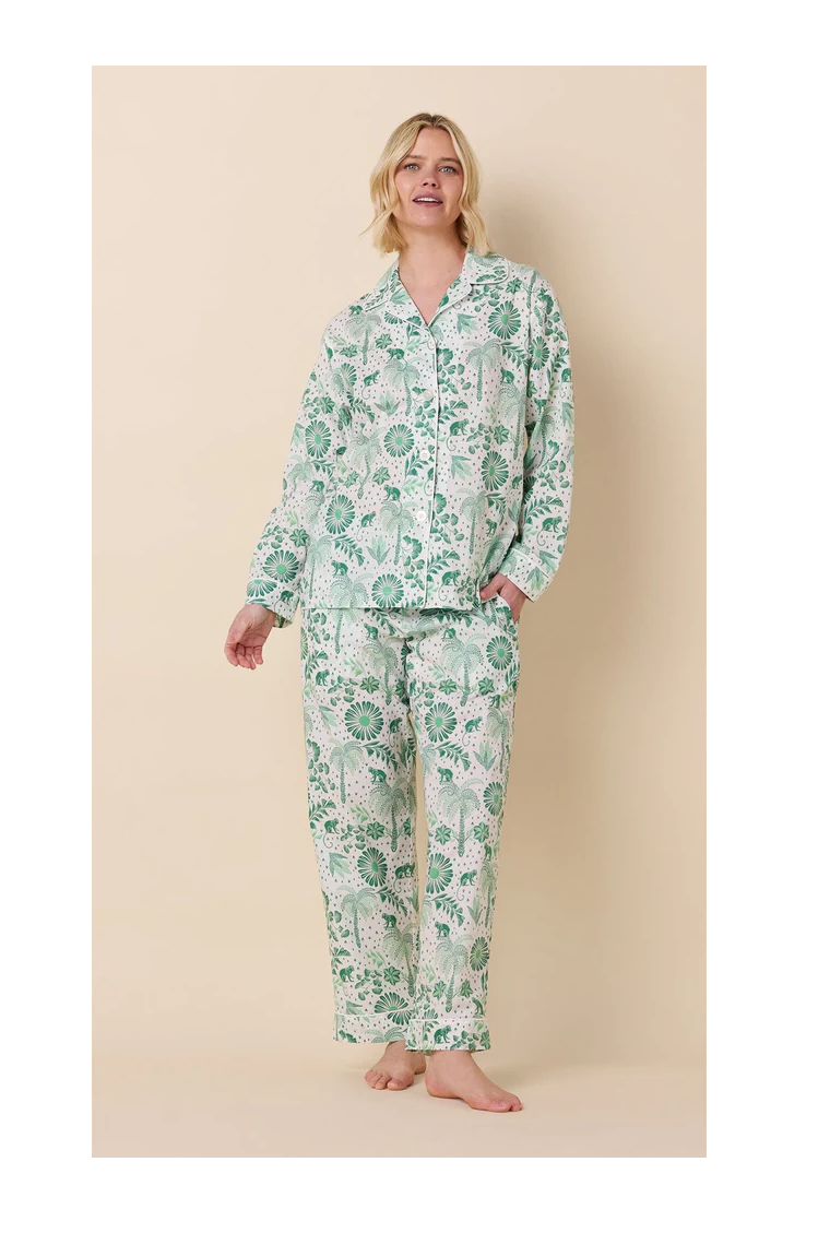 Palmera luxe Pima cotton pajama set from The Cat’s Pajamas — an elevated, silky-soft finish with refined detail. Machine washable. Made in the USA.