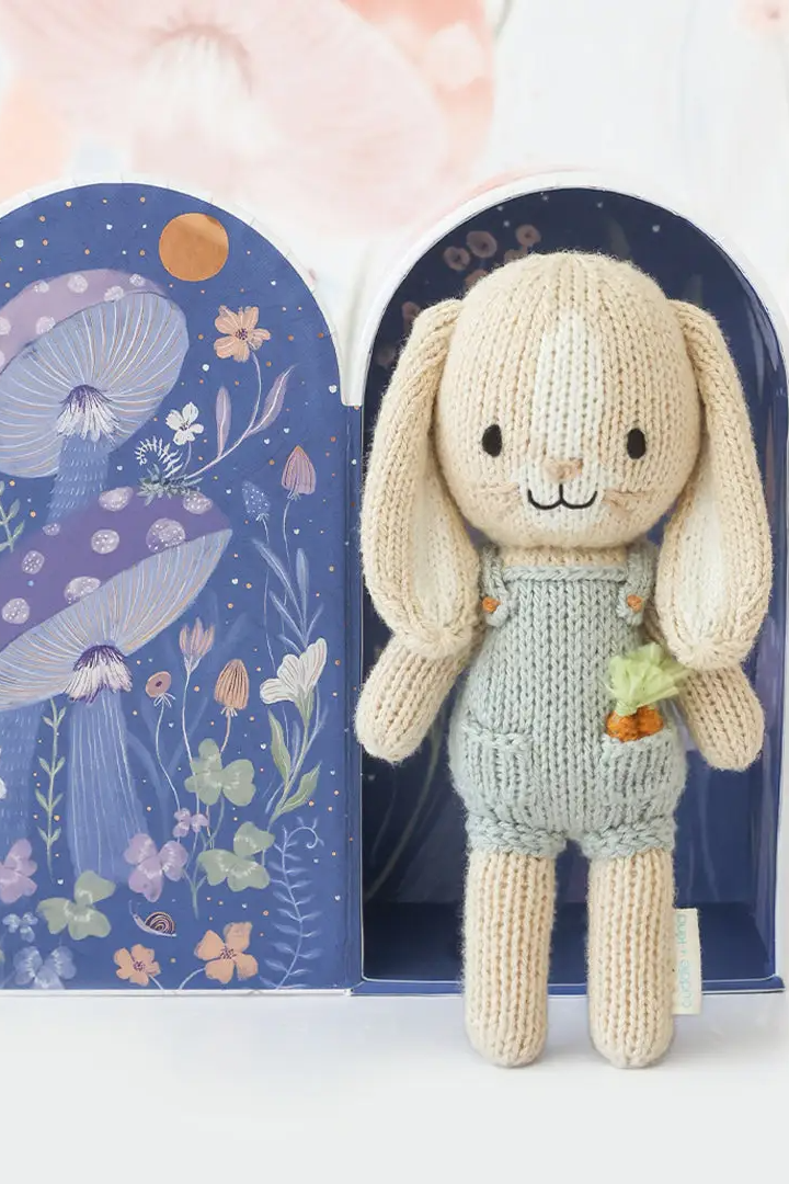 This knit puppy stuffed animal is a soft, hand-sized plush designed for little hands. The knitted texture and simple embroidered face make it gentle and safe for newborn play and cuddling. Lightweight and portable, the toy works well for soothing and early sensory exploration.