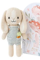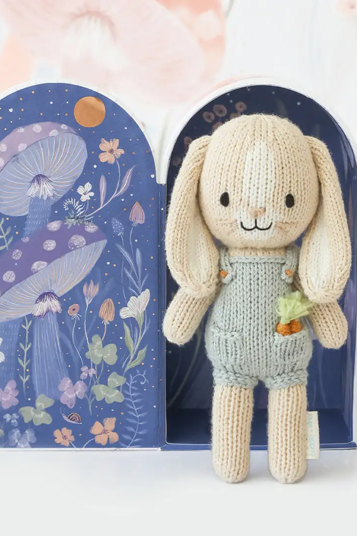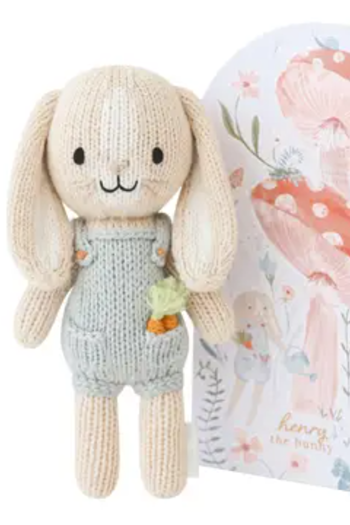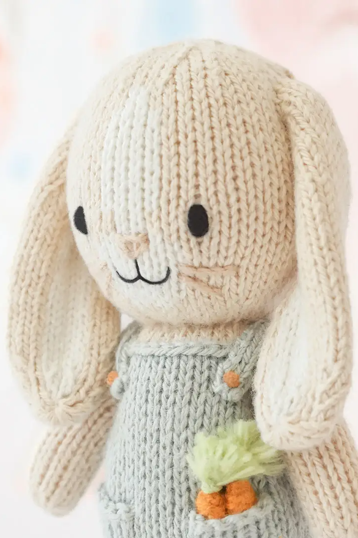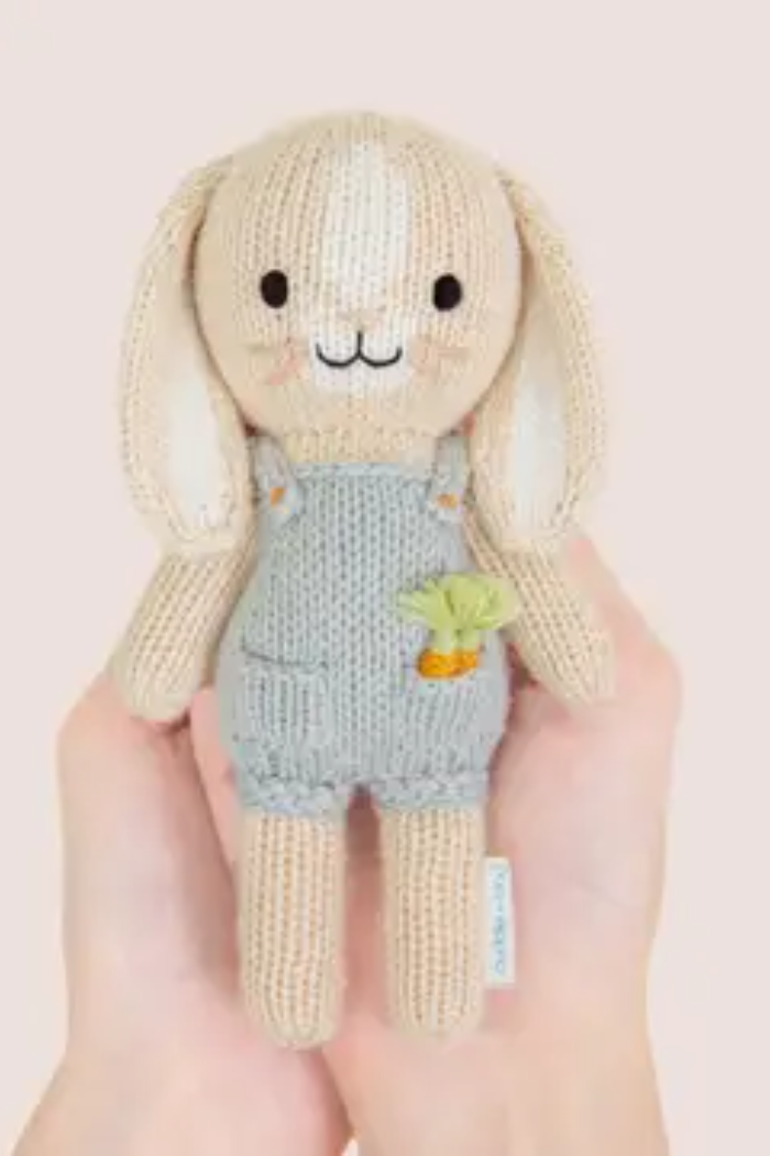 A tiny knitted bunny with embroidered facial details and a removable-looking knit overall, perfect as a small comfort toy. Tiny Henry the Bunny is hand-sized and features a carrot applique for charming, storybook style. This cuddly companion is crafted in soft yarn and made for gentle play and display. The product is from CUDDLE + KIND and reflects the brand’s charitable mission tied to meal donations.