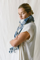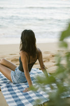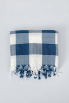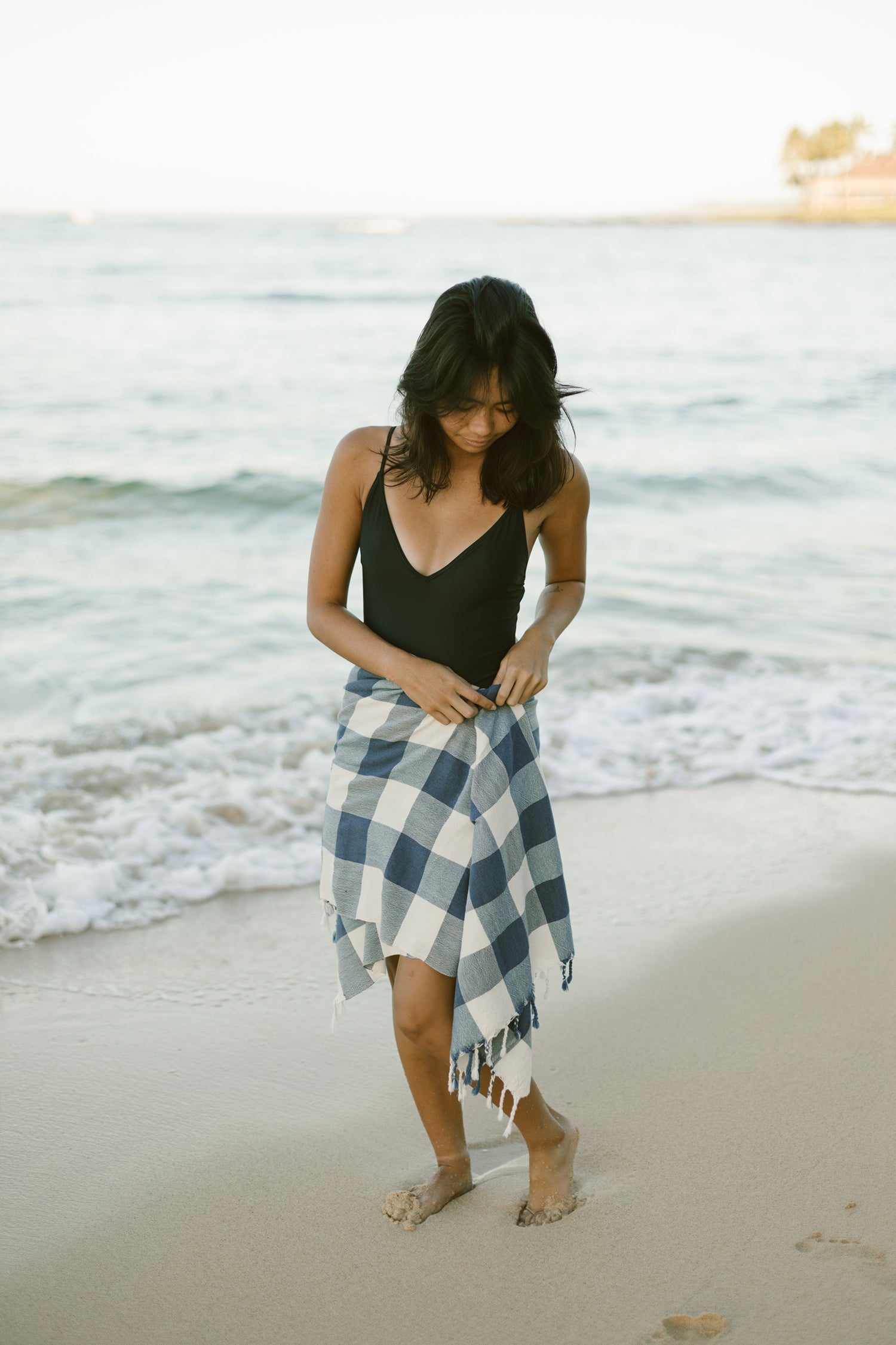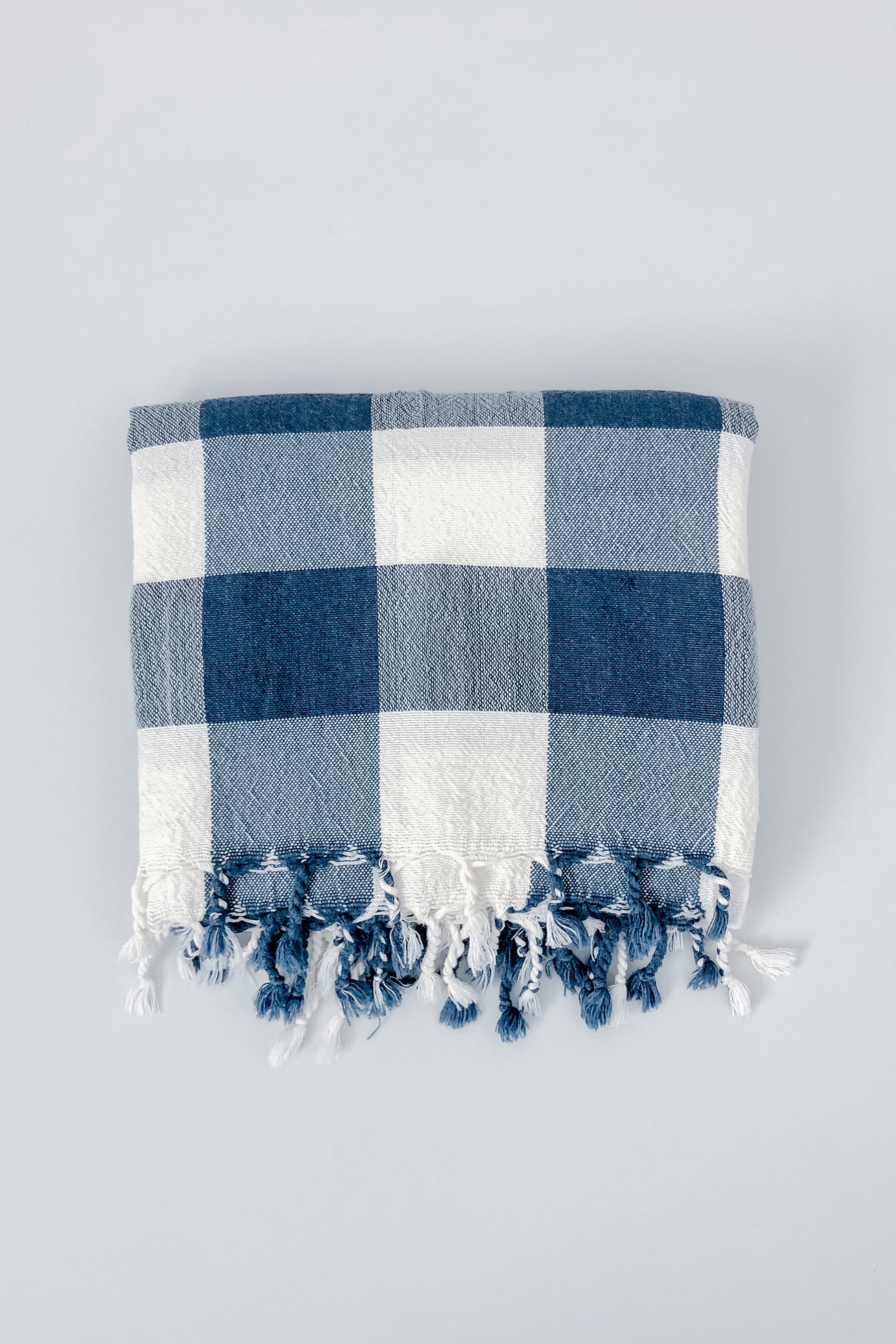 Ivory Navy Gingham Turkish bath towel from Home & Loft, handwoven by skilled artisans on the coast of Turkey. Also known as a pestemal — lightweight, quick-drying, and gets softer with every wash.