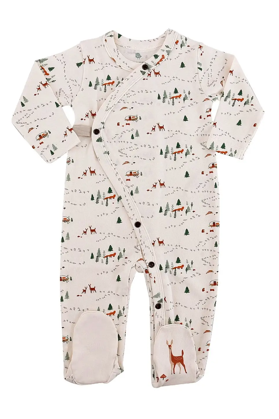 This sweet footie is designed with flexibility in mind (and a deer on the bottom of the left foot!). The print features tiny trees and forest creatures that will have your little one dreaming of the great outdoors. Made from buttery-soft organic cotton, our footie includes easy-snap fasteners for quick access when changing or bathing.