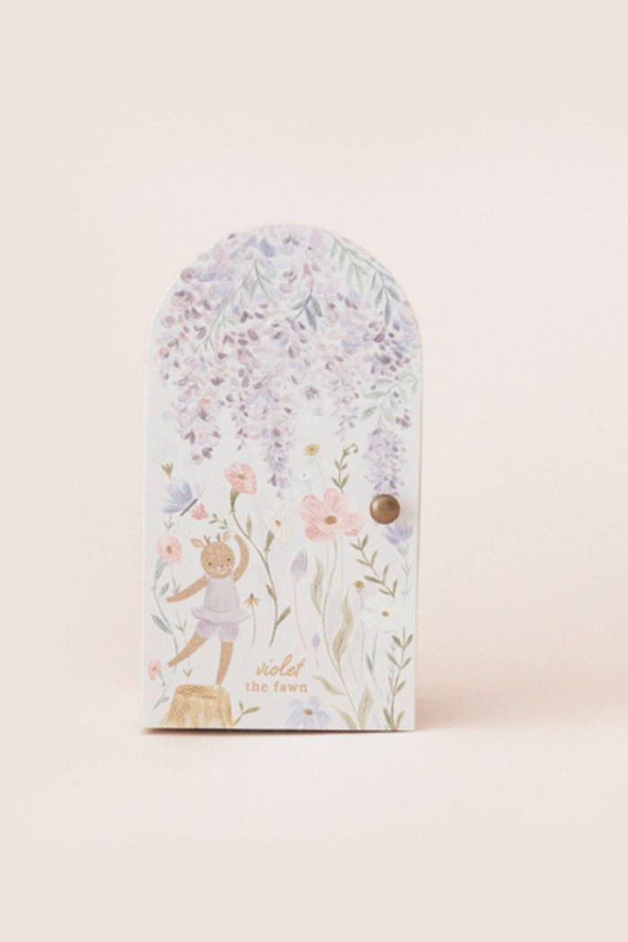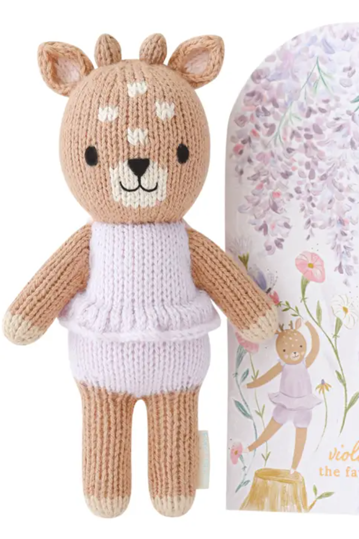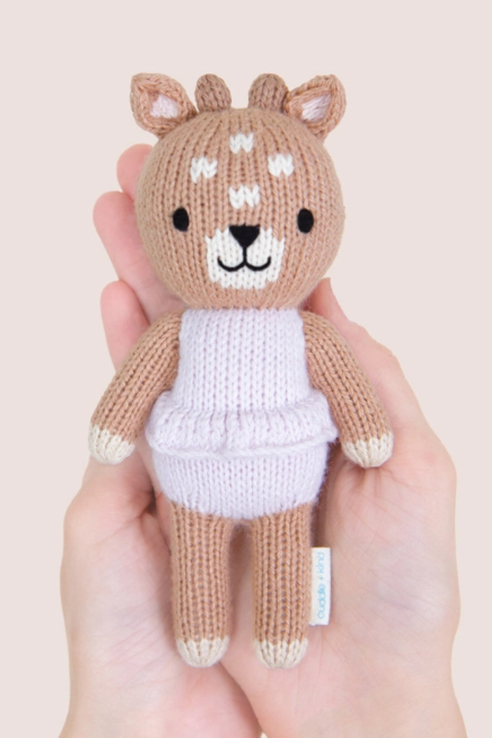 A petite knit fawn toy with embroidered features and a soft lavender outfit, perfect for cuddling and display. The CUDDLE + KIND Violet Fawn Mini is hand-knit with a gentle texture that suits nursery shelves or stroller time. It arrives with a illustrated keepsake box, making it an easy gift for new families. Lightweight and soft, this mini stuffed animal is made for small hands and everyday snuggles.