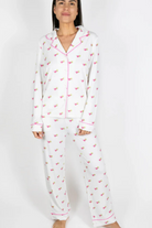 Limited, exclusive, and never repeated.A soft two-piece pajama set in a tiny floral print, designed for lounging and sleep. The Floral Long Sleeve Pajama Set features a button-front, notched collar top with long sleeves and matching full-length pants trimmed in contrast piping. Lightweight knit fabric gives it a relaxed drape and easy movement for cozy nights at home. This set works equally well for weekend lounging or as a comfy travel sleep layer.