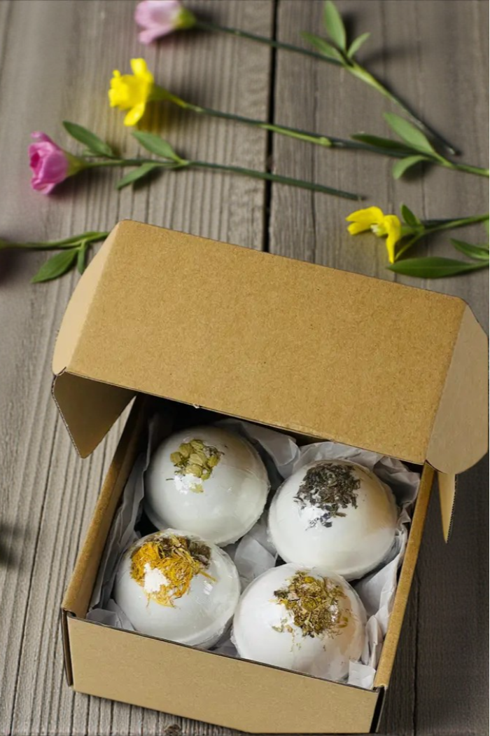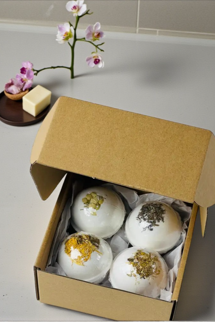 A set of four herbal bath bombs crafted for gifting occasions like Valentine’s Day, birthdays, or thank-you presents. The Herbal Bath Bomb Set includes botanical pieces pressed into each round fizzy bomb for a gentle, aromatic soak. Lensik I&V blends visible dried herbs with a moisturizing base for a premium spa-like experience at home. This set makes a thoughtful, ready-to-give present.