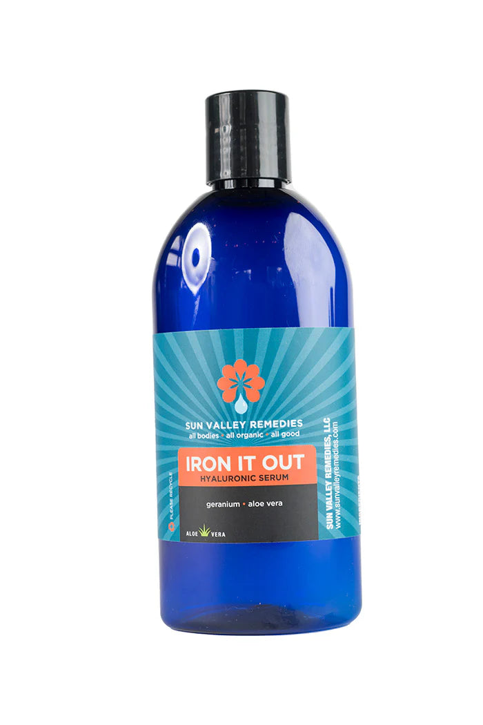 A moisturizing hyaluronic serum formulated to smooth and hydrate skin. Sun Valley Remedies Iron It Out Hyaluronic Serum blends aloe vera and geranium in a lightweight, fast-absorbing formula. The product comes in a blue plastic bottle ideal for daily skincare routines and targeted smoothing treatments.