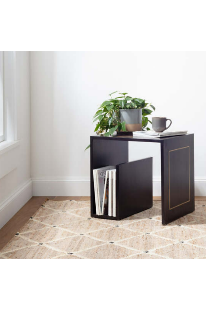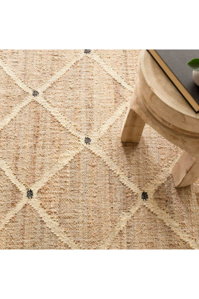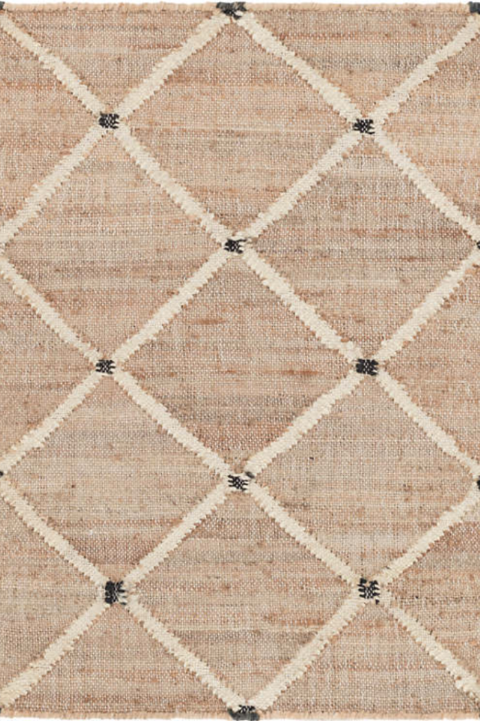 A large ivory latticework pattern emerges from the relaxed natural jute kilim weave foundation with a punctuating charcoal dot at the interstices. This simple flatwoven jute design offers beauty and appeal on a scale that makes it modern and timeless. Eco-friendly, ultra-durable, and great for any indoor room.