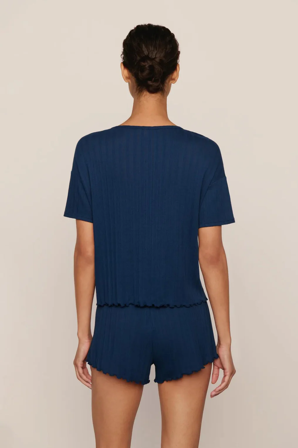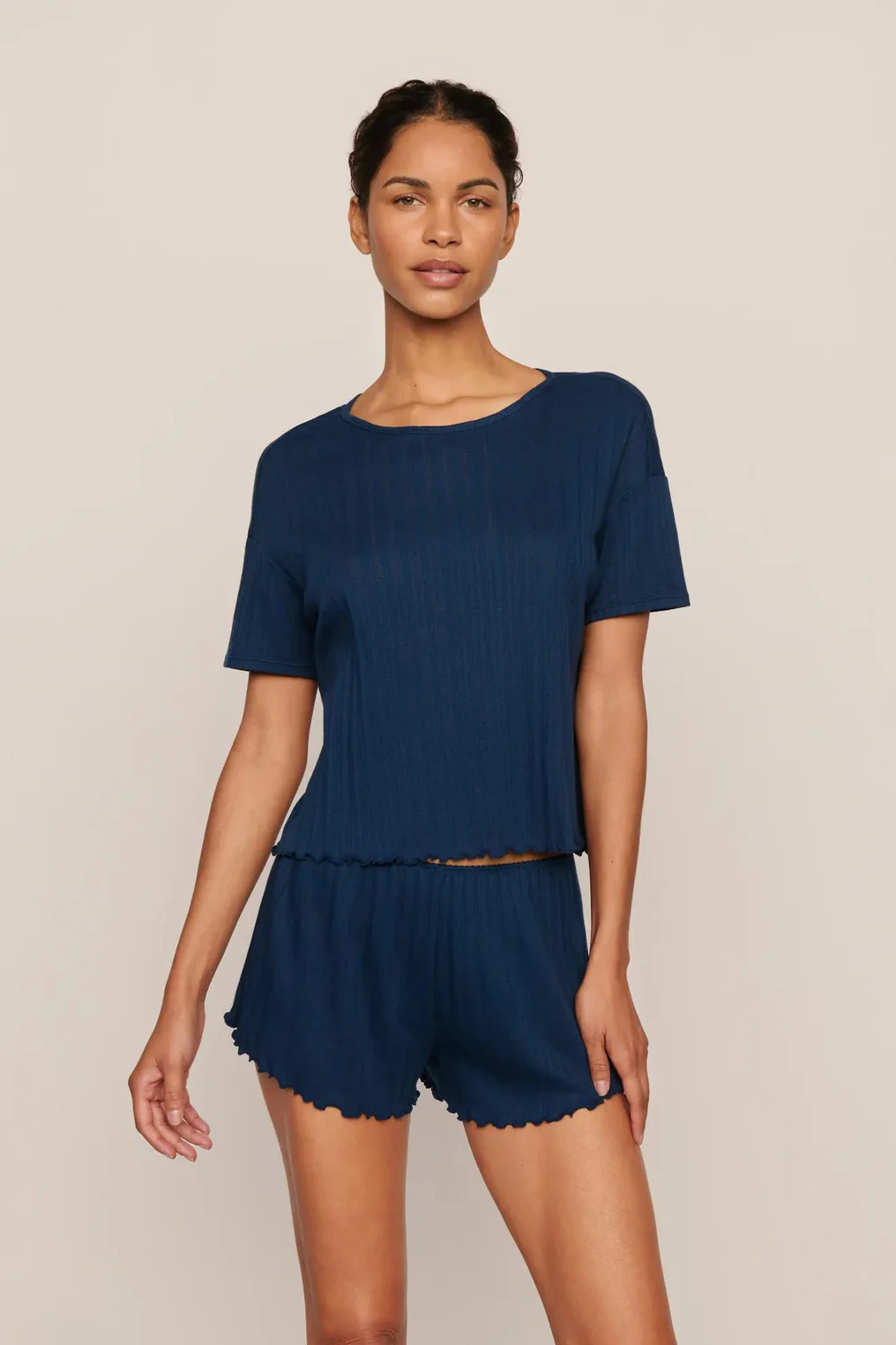 Feel the softness in Eberjey's Pointelle Collection. Made from a cotton and TENCEL Modal blend, OEKO-TEX Standard 100 certified. This crew neck short sleeve tee features a relaxed fit, dropped shoulder, and lettuce edge hem. Lightweight pointelle knit with subtle texture for easy layering or solo wear. Pairs well with the Pointelle Short or Pointelle Pant.