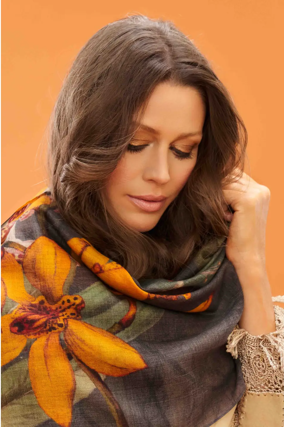 Wool Wrap Oversized Botanicals Scarf Orange flowers