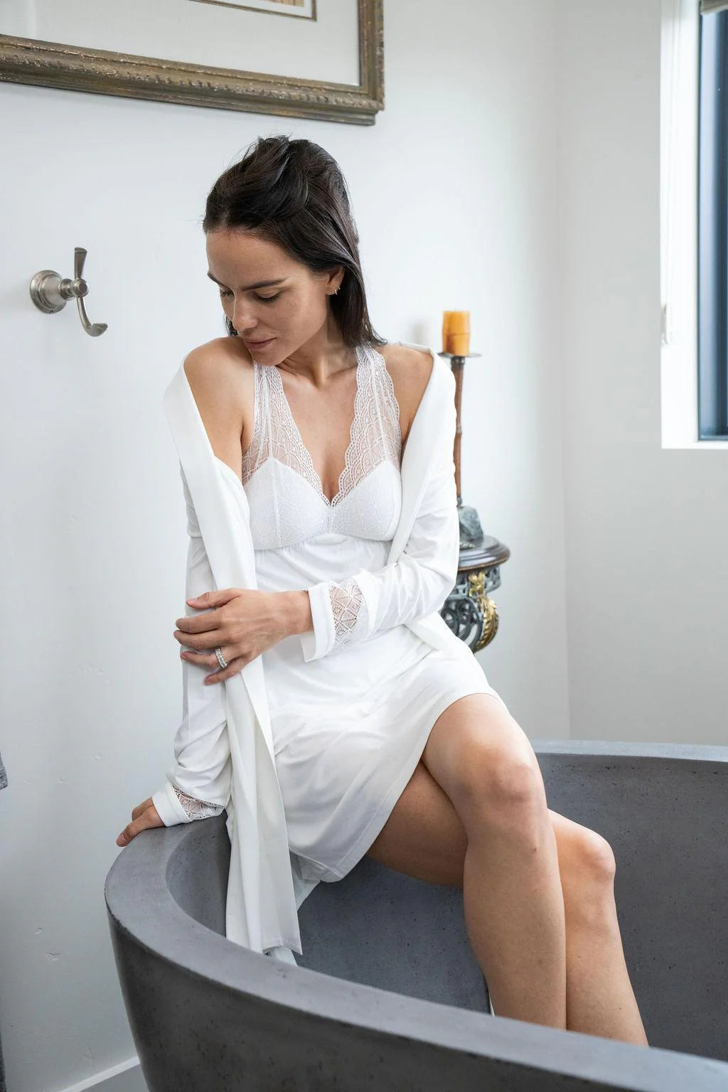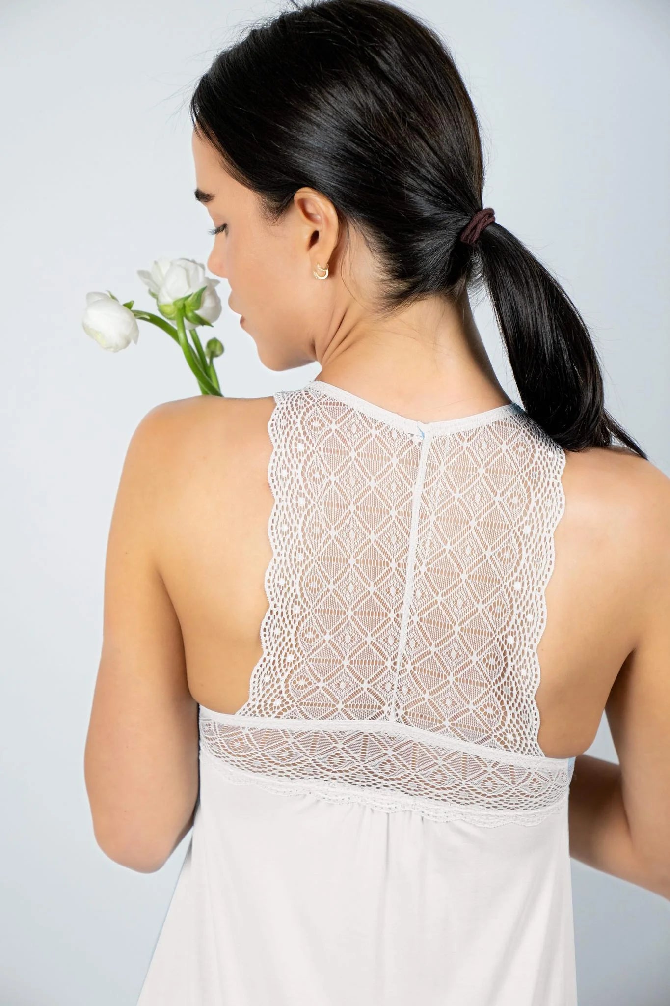 A body-skimming racerback chemise in ivory with luxe lace panels under the bust and a stretch-lace back. Sleek, modern, and comfortable for sleep or lounging.