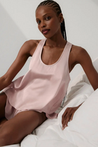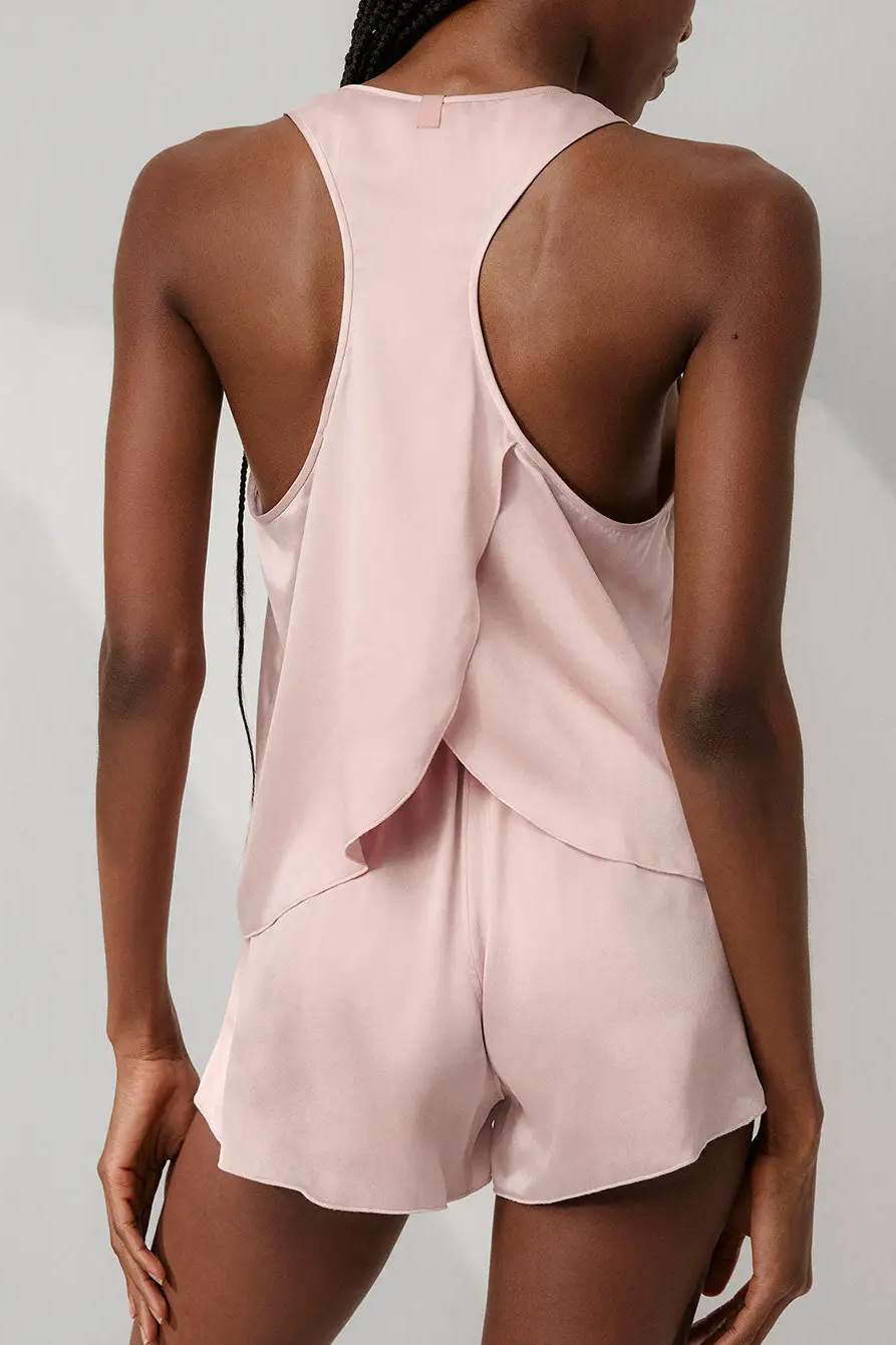 A lightweight satin cami and shorts sleep set designed for warm nights and easy lounging. The Satin Cami & Shorts Set features a racerback-style cami with draped overlap detail and soft, relaxed shorts for a comfortable fit. Its silky finish and airy silhouette make it ideal for cozy evenings at home or a relaxed weekend morning. The set leans casual and effortlessly feminine for everyday sleepwear.