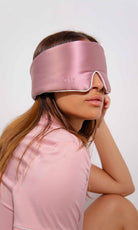 A luxurious pink silk mask with elegant white piping detail along the edges. Crafted from 22 Momme mulberry silk, this handmade sleep mask blocks light completely while protecting skin and lashes.