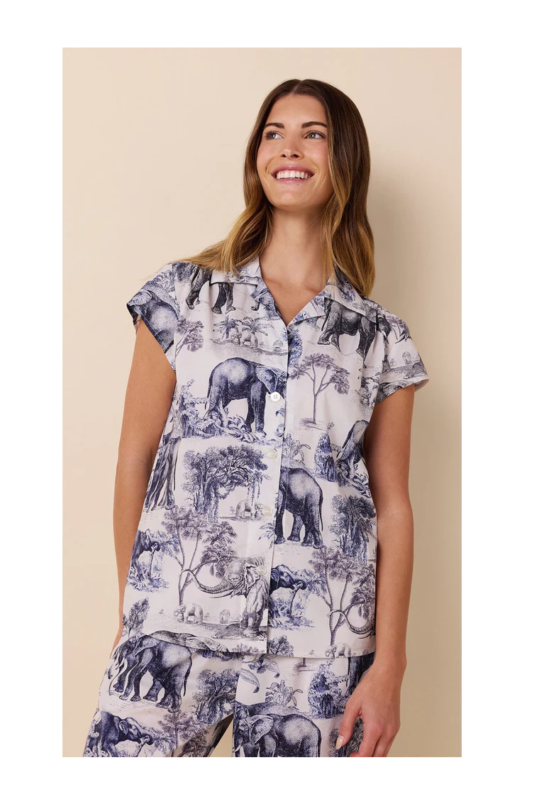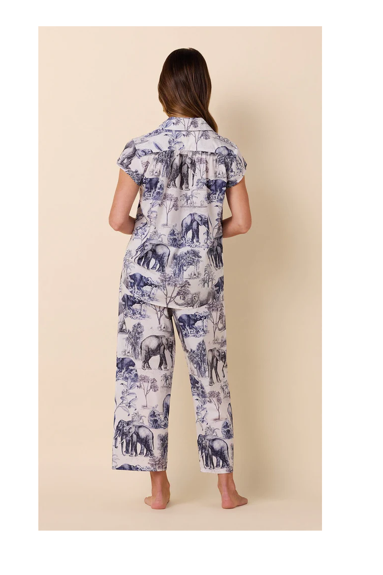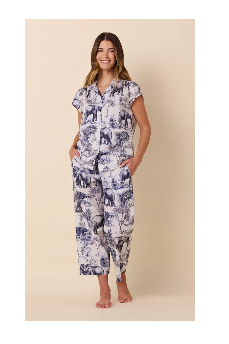 Safari Toile printed Pima cotton cropped pajama set from The Cat’s Pajamas — supremely soft with a relaxed fit. Machine washable. Made in the USA.