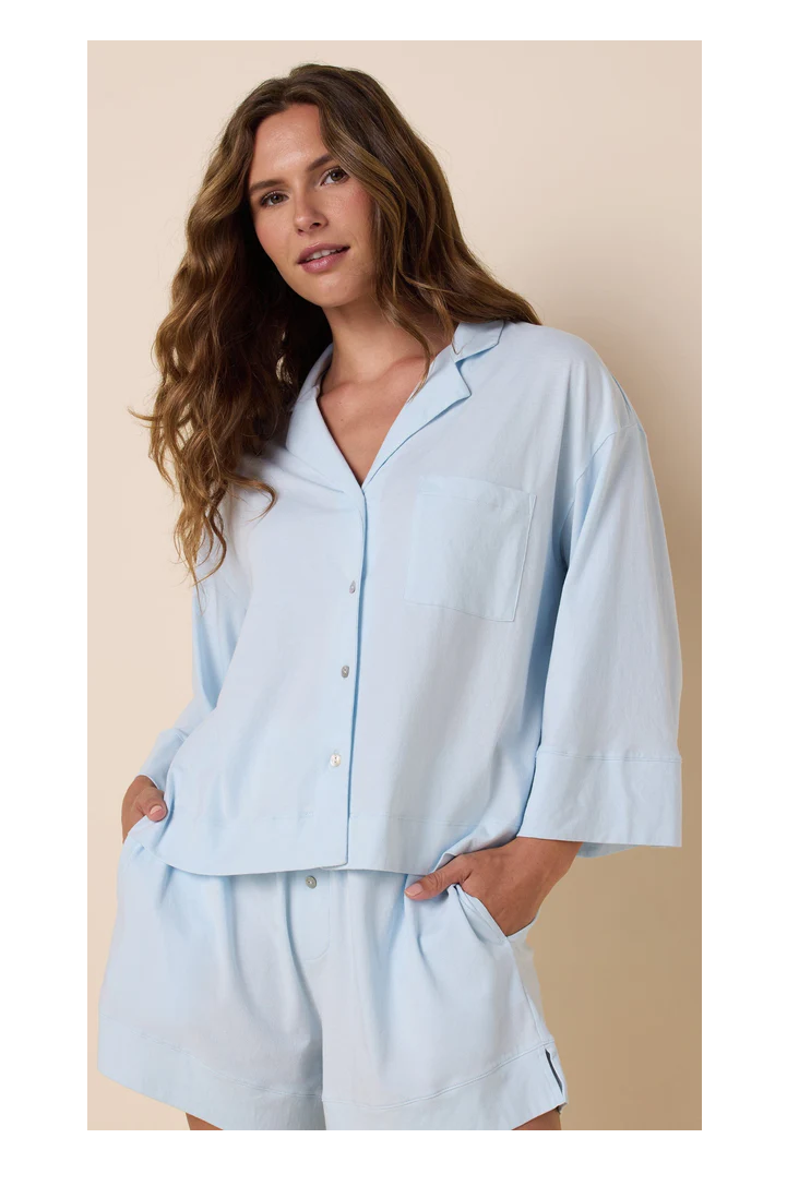 Mariposa printed Pima cotton long sleeve short set from The Cat’s Pajamas — supremely soft with a relaxed fit. Machine washable. Made in the USA.