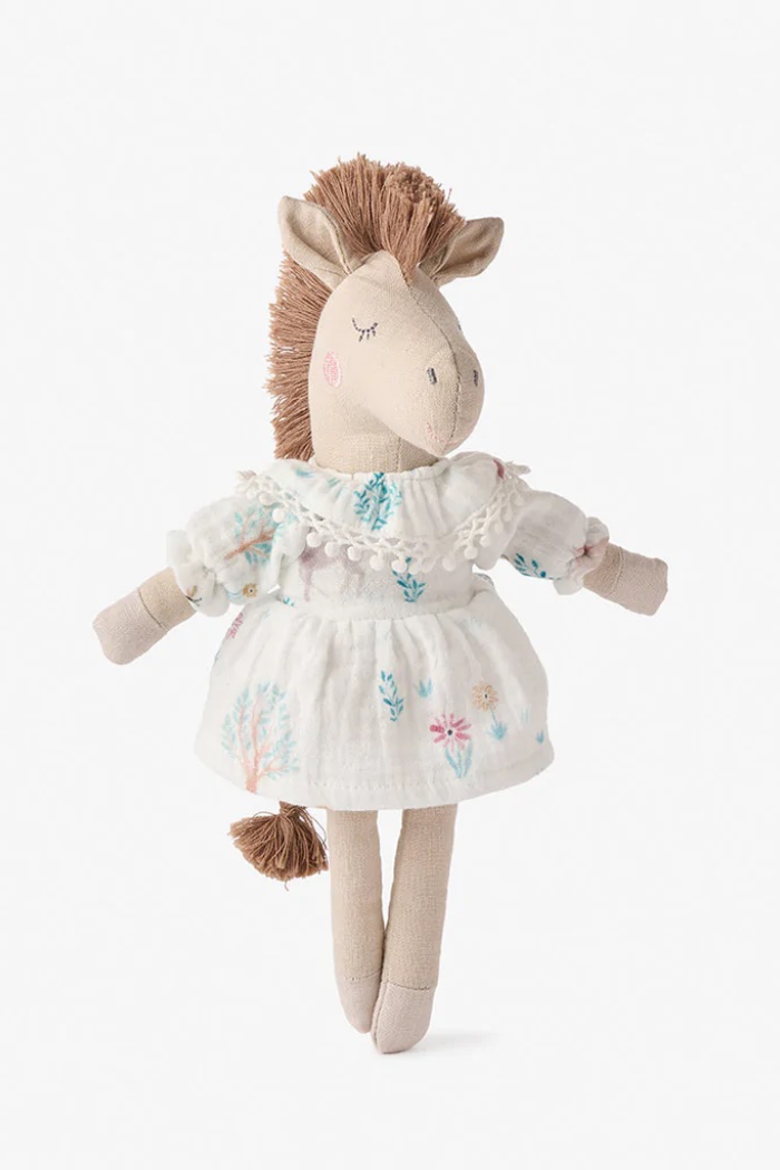 Body: 100% Linen, Outfit: 100% Organic Cotton, Stuffing: 100% Polyester, Plastic pellets