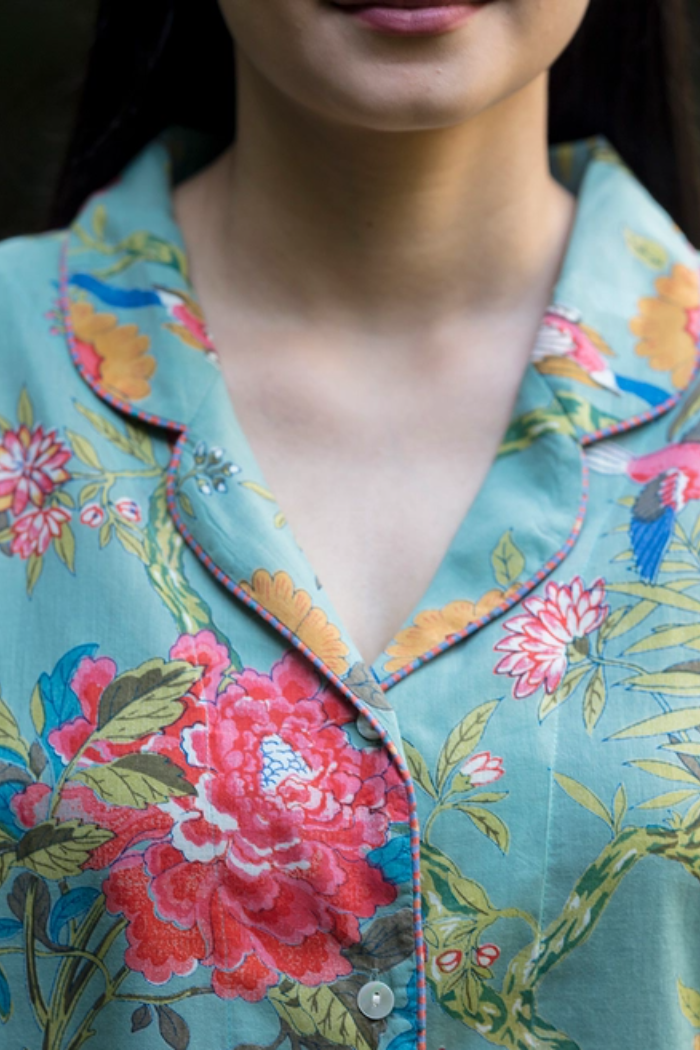 Bird Teal shorts and top pajama set from Handprint in 100% cotton voile. Cool, breathable, and hand block-printed by artisans in India with vibrant teal bird motifs.