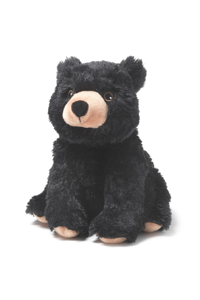 Microwaveable black bear plush from Warmies — filled with French lavender for calming warmth. Heat in the microwave for soothing comfort.