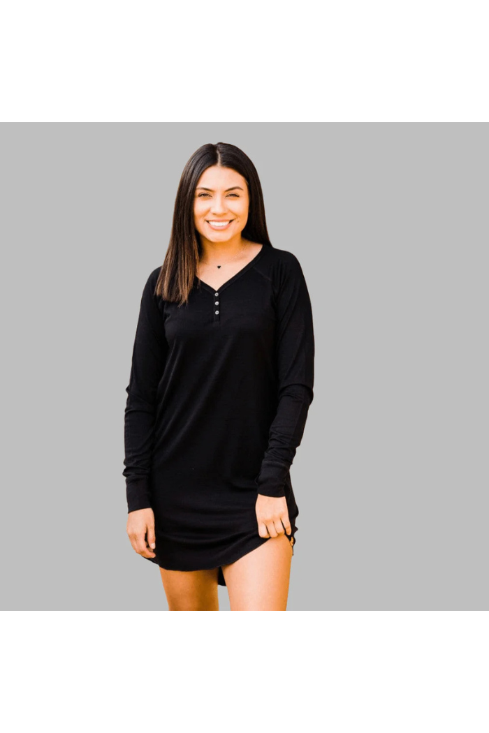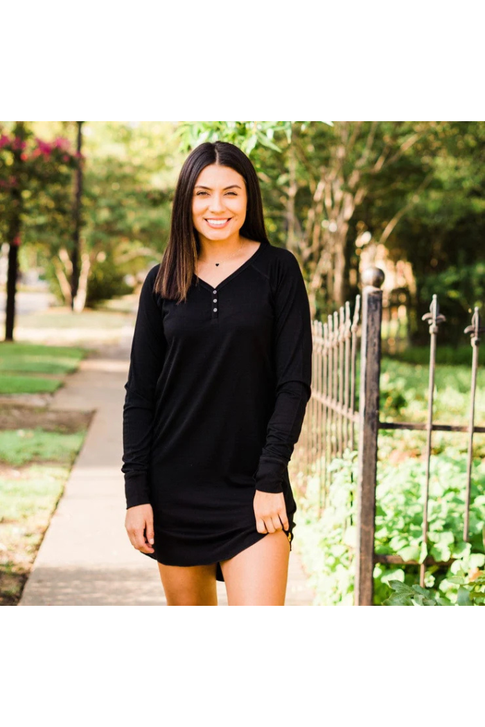 This ultra-soft 3 button Henley nightshirt with raglan sleeves is perfect for cozy snuggling on chilly evenings. Flatlock stitching, shirttail hemline and long cuffs with thumb holes make this a cool weather favorite. This timeless nightshirt is a perfect blend of comfort and style.