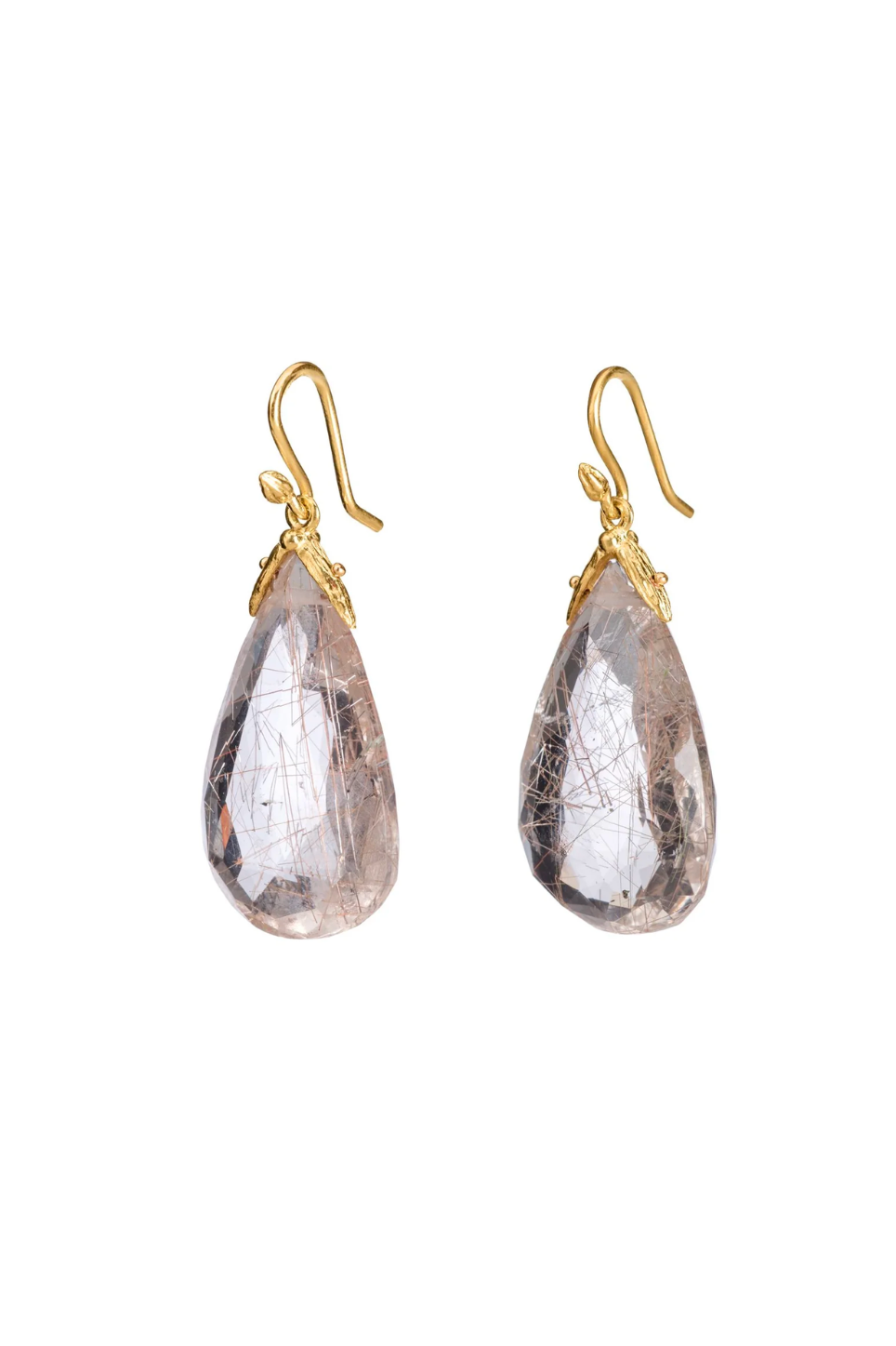 Brilliant, two-of-a-kind golden rutilated quartz large teardrops reflect light with their internal shards, and are held by Gabrielle's med18k double-seed and single seed earwires.