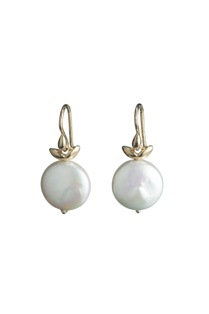 Large, exquisite coin pearls are set on a 14k gold double-wing mount and dangle gracefully from Gabrielle's 18k single-seed earwire. These classic earrings make a statement with their elegant and substantial presence.