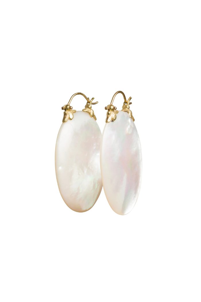 Oval wafers of mother of pearl gracefully hang from Gabrielle's 18k petal flyer settings. Their iridescence offers a subtle yet captivating glow in any light, making mother of pearl an excellent choice for adding a hint of sparkle to both daytime and evening attire.