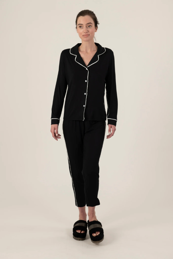 This pajama set features a long-sleeve button-down top and pull-on pants with an elastic waistband, both trimmed with luxurious Japanese piping. The ankle-length pants have a gentle flare, creating a sleek, slim silhouette that elongates your frame.