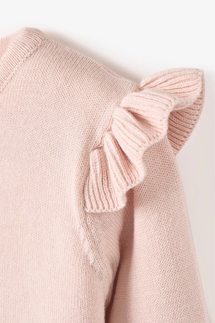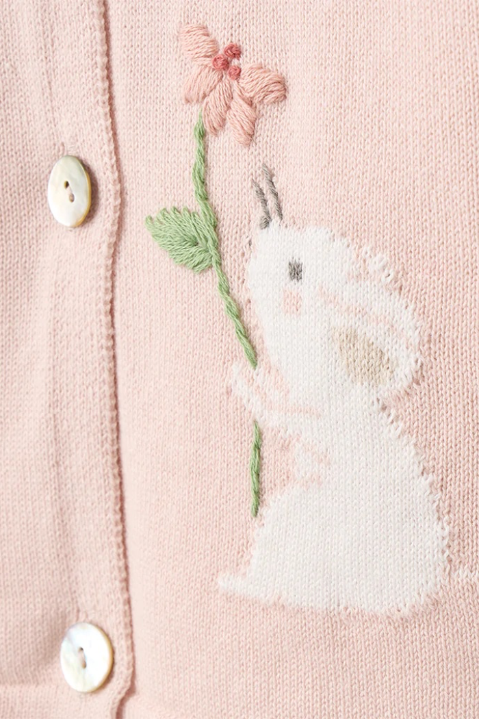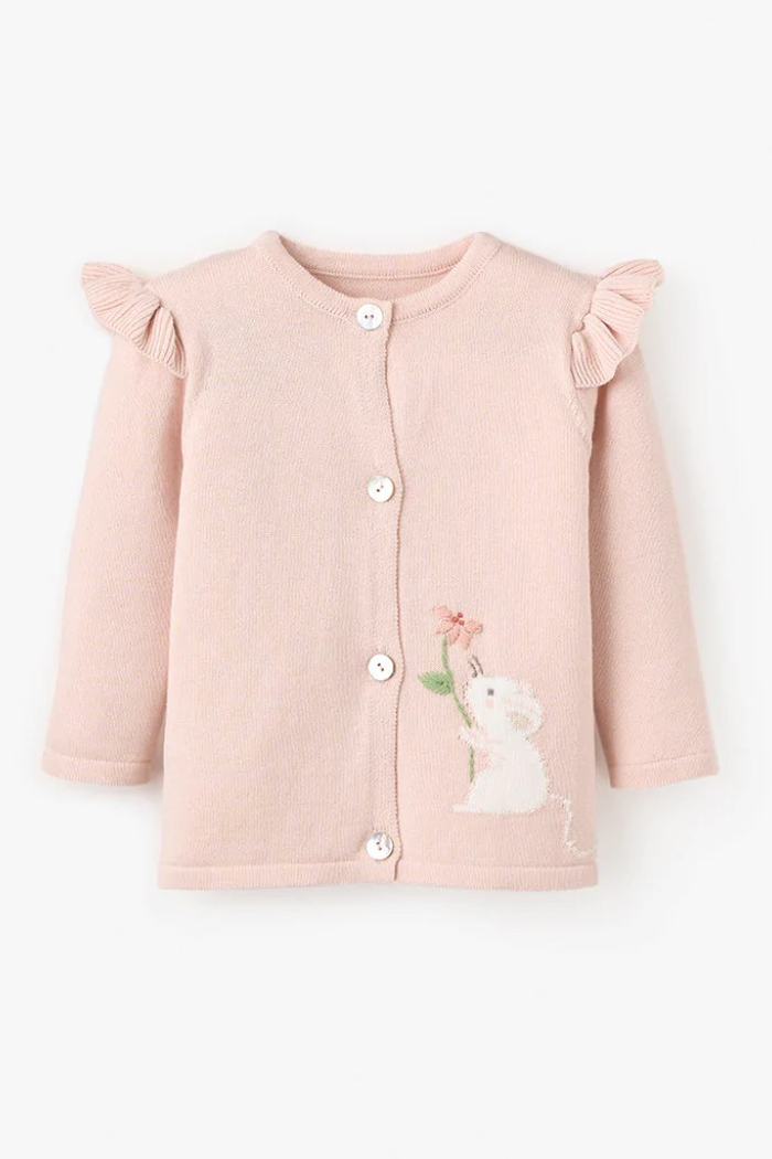 Elevate baby's sweater game with this meadow mouse-embroidered, knit baby cardigan. Artfully designed with a hand-crocheted mouse embellishment and ruffle detail, this knit sweater layers perfectly over any of the printed muslin styles.