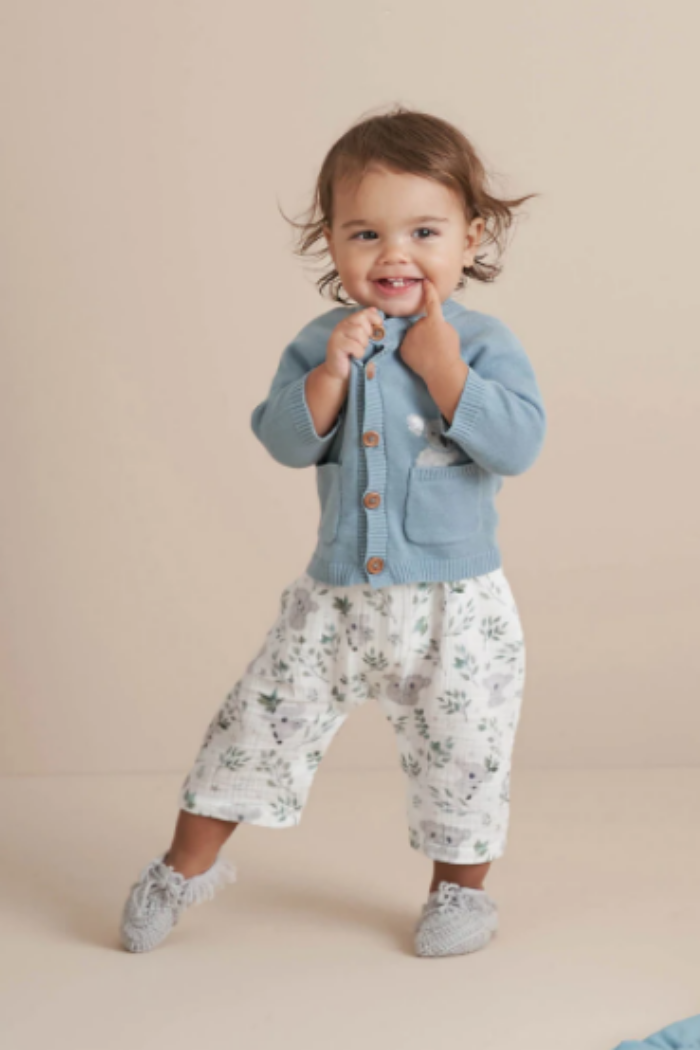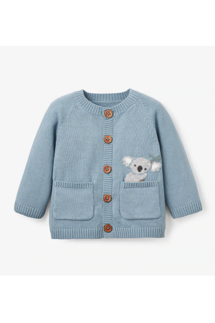 Elevate baby's sweater game with this playful, peek-a-boo koala knit baby cardigan. Elegantly finished with wooden buttons and ribbed trim, it is the perfect layering piece to the koala printed muslin collection. A variation on our bestselling cable knit baby cardigan, this lightweight spring layer pairs perfectly with muslin, cotton and other fabrics of the season.