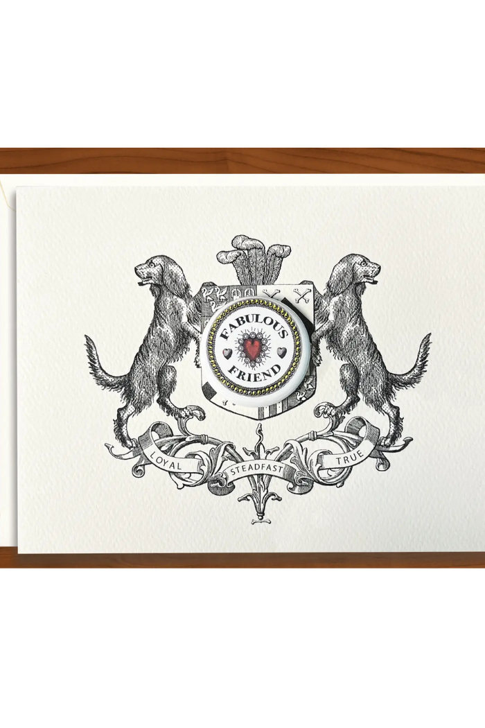 4.25 x 5.5 Heraldic Greeting Card on heavy textured cream-colored paper, featuring an attached and removable button pin.