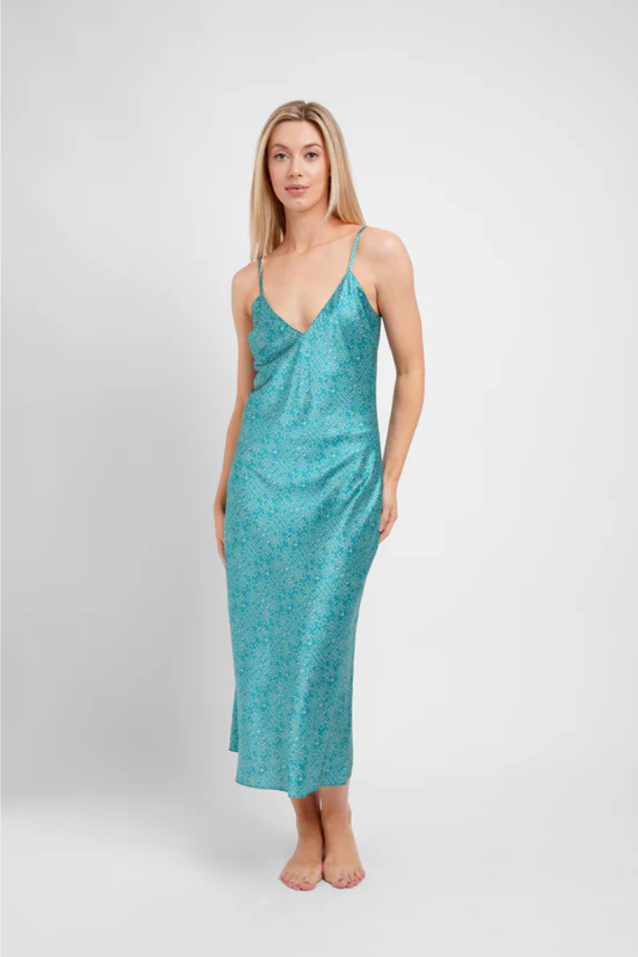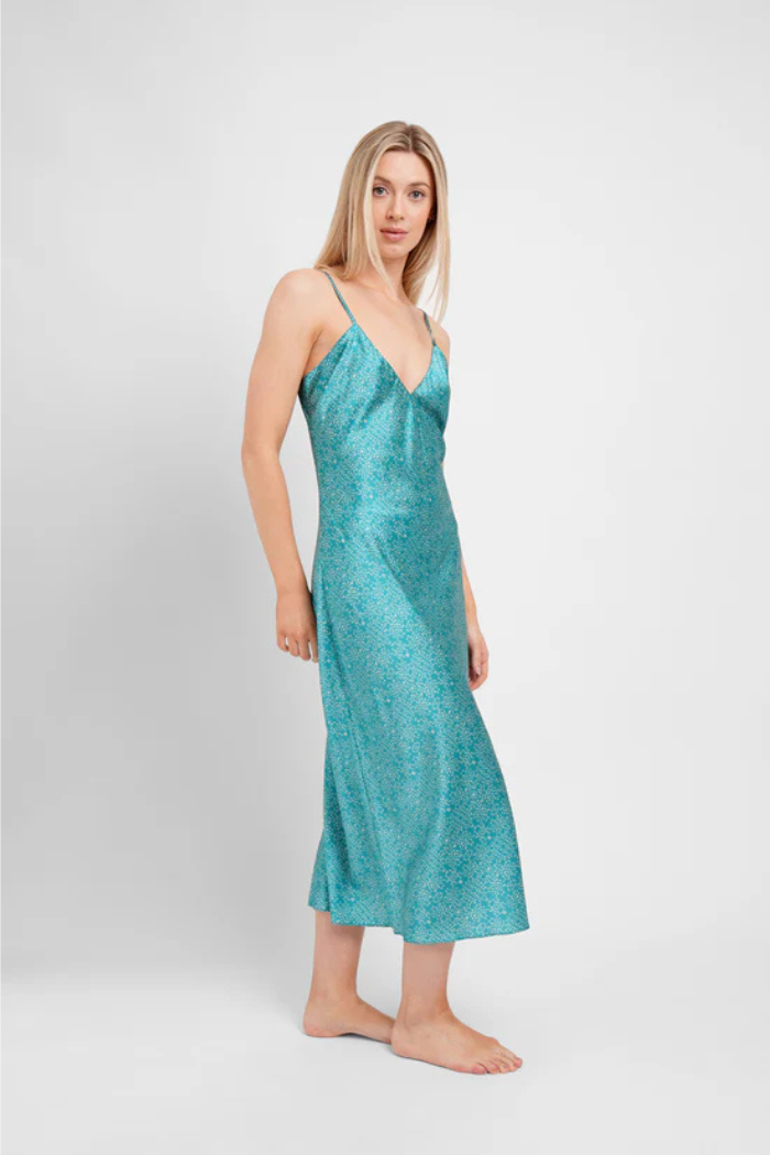 A modern take on a timeless favorite, our star print dazzles in a stunning teal hue. This luxurious silk midi slip showcases a captivating pattern of shimmering stars, bringing a celestial charm to your sleepwear collection. Made from the finest silk, it offers an ultra-soft, breathable, and comfortable feel. The adjustable straps ensure a personalized fit, while the elegant midi length adds a refined touch. Perfect for lounging or bedtime, this silk slip will leave you feeling effortlessly chic and confident.