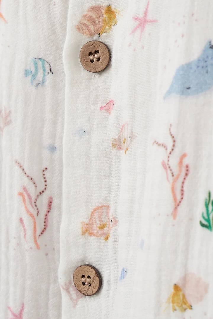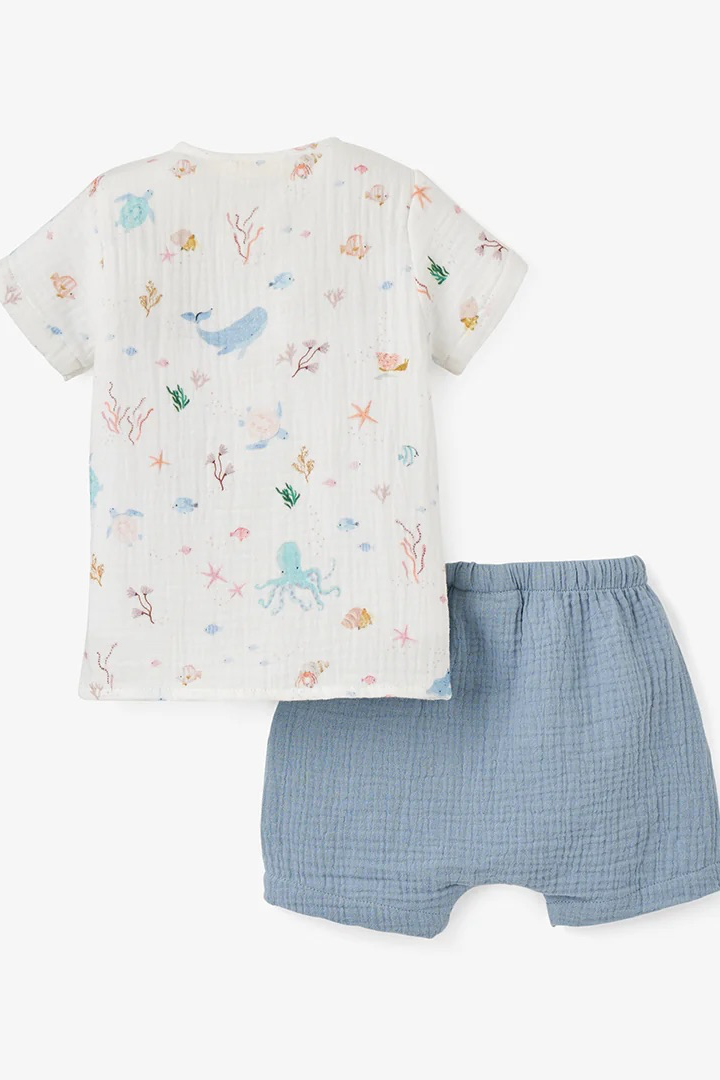Good for baby, good for the environment. This organic, naturally sustainable muslin is soft and breathable, ideal for outdoor adventures during the spring and summertime. Cast in a dreamy palette, this muslin tee + short set combines fashion and function for the modern child. Wooden buttons add an extra dash of style to this already stunning organic baby set.