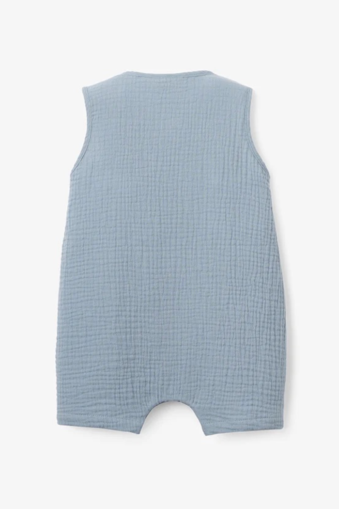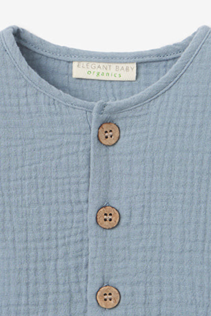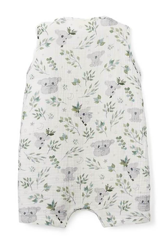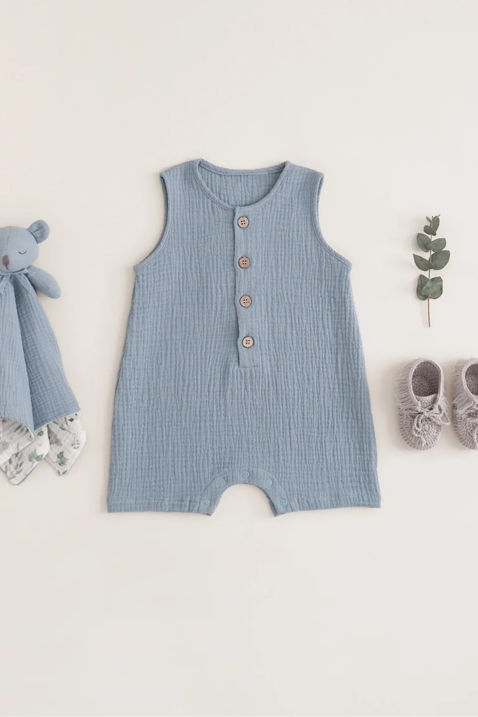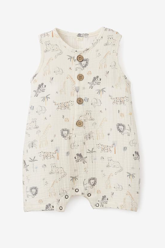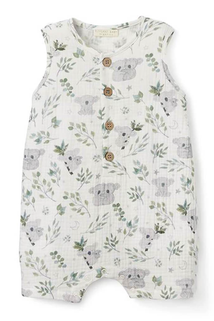 Good for baby, good for the environment. These organic, naturally sustainable muslin is soft and breathable, ideal for outdoor adventures during the spring and summertime. Cast in a sweet koala print, this muslin shortall baby romper combines fashion and function for the modern child. Wooden buttons and a henley collar add an extra dash of style to this already stunning organic baby romper.