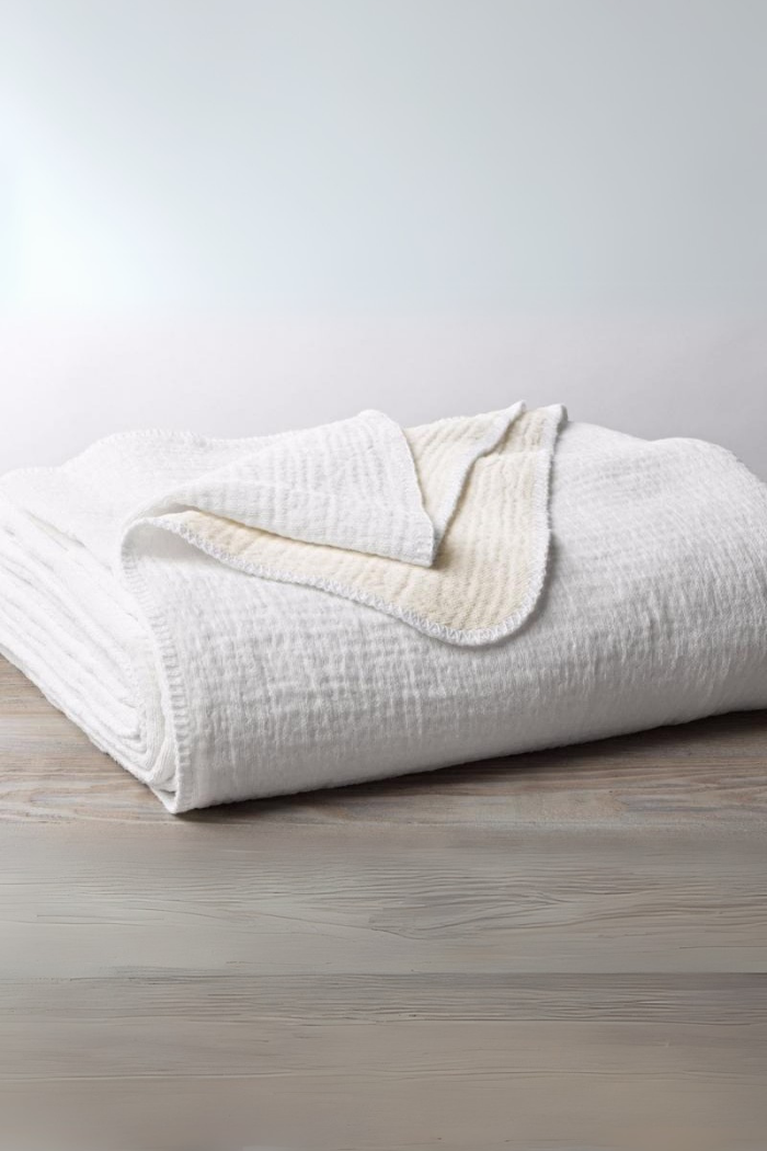 For natural, next-to-skin softness, Cozy Cotton combines the perfect blanket weight with organic cotton chenille yarn, creating lightweight warmth that feels plush to the touch. Washed for a gently puckered texture and finished with a color-matched blanket stitch all around, this versatile blanket works well on its own or stacked for added warmth. Each color reverses to softwhite*, offering two ways to layer (*blush reverses to alpine white).