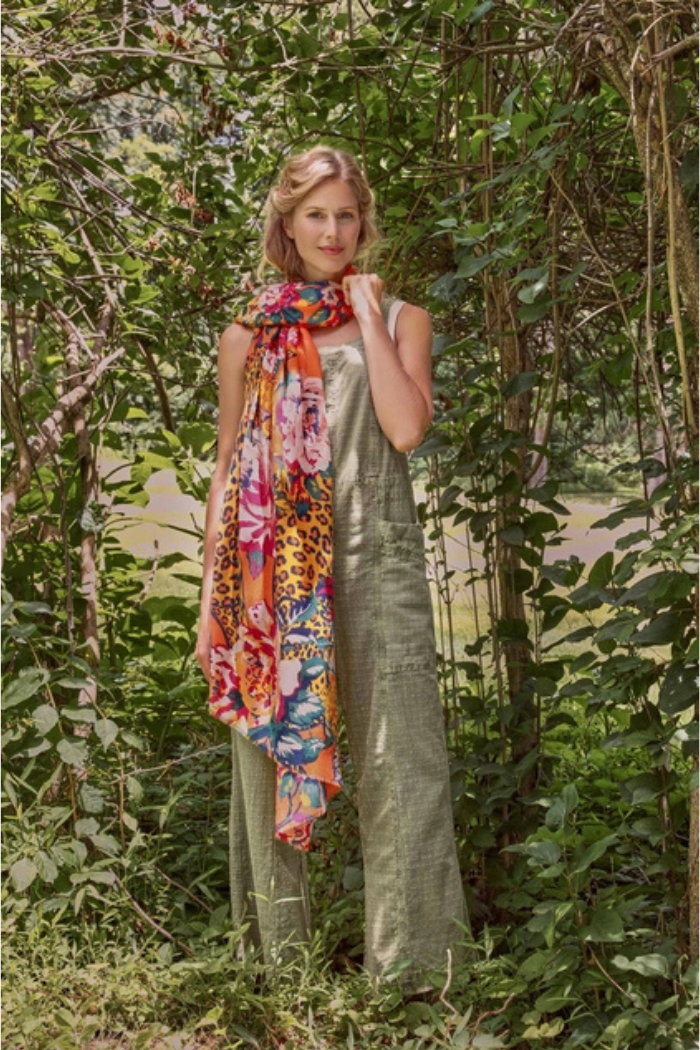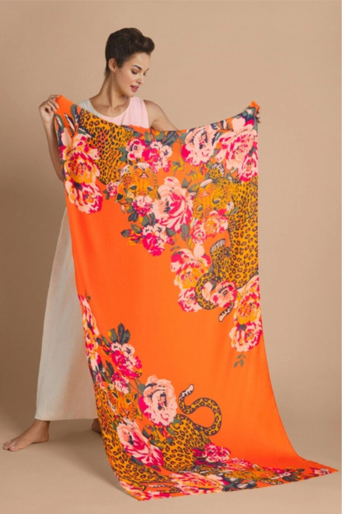Make a bold statement with this vibrant tangerine print scarf, perfect for adding a touch of fierceness to any outfit! Featuring a striking blend of summer florals and exotic leopard print, it’s the ultimate way to embrace your wild side. A leopard never loses its spots—or its place in fashion! Ideal for Mother’s Day, this scarf comes in a bespoke complimentary gift bag, making it an extra-special treat for a loved one or yourself.