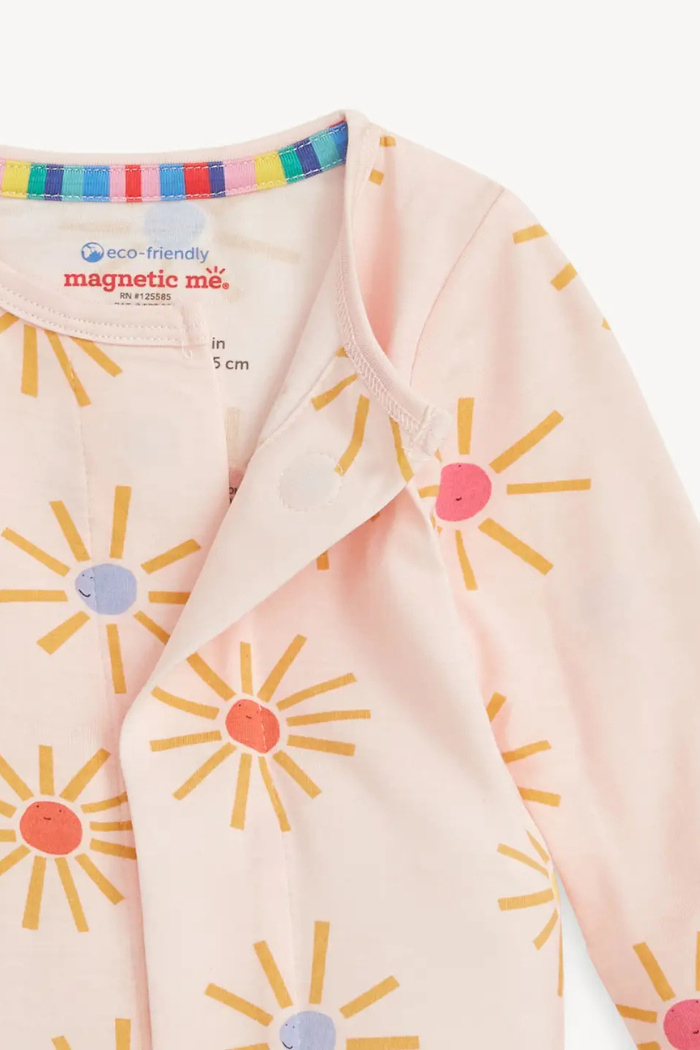 Magnetic closures: magnets run from the neck to upper thigh for sizes up to 0-3m & from neck to crotch for sizes 3-6m and above.