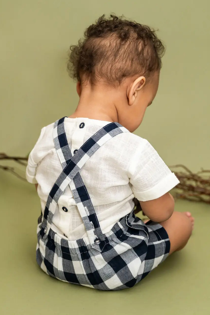 Romper: Made from soft navy yarn-dyed gingham fabric, featuring adjustable shoulder straps, snap closure at the crotch, a front pocket, and lining for added comfort.