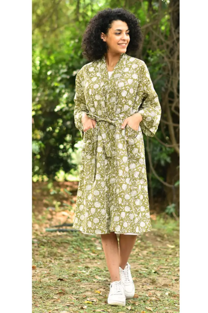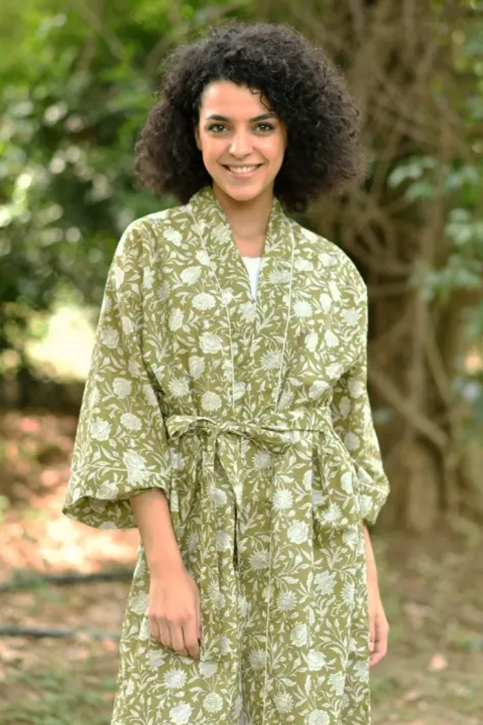 Effortlessly breezy, the Sundari Olive Kimono is a printed, belted wrap with wide sleeves and a relaxed silhouette perfect for layering brings artisanal block-print detail and a lightweight cotton feel ideal for warm-weather days or lounging at home. Wear it over basics as an easy statement layer for vacation or casual outings.