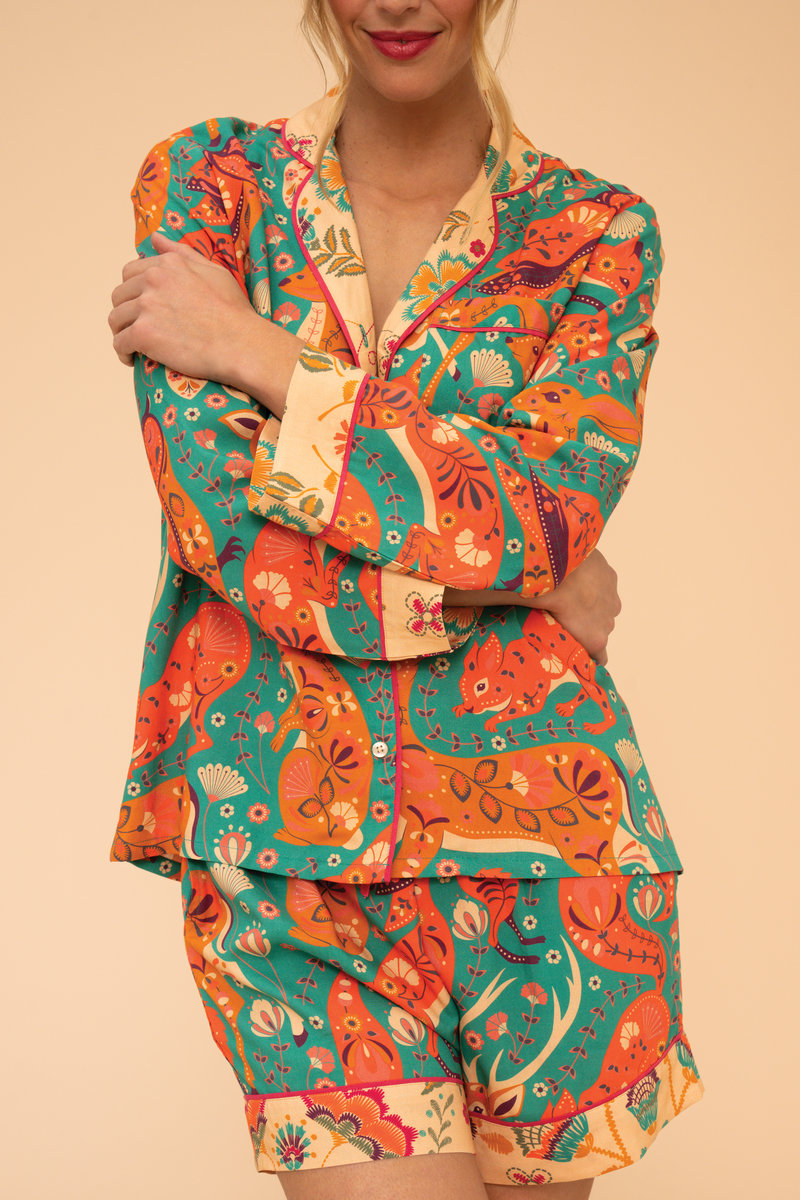 Obsessed with fall and fairytales? Dive into a dream like design with these vibrant folk-art friends pyjamas, both feminine and whimsical. Playful florals dance among rich tones and forest friends to create the most decorative and Powderful symmetry. With shorts and a long sleeve top, these super soft pjs in aqua have an oversized fit to keep you feeling luxurious and fabulously well rested every day. Available in small, medium, and large sizes. Each pair comes with a complimentary gift bag so these will be even more special when shared with a friend!