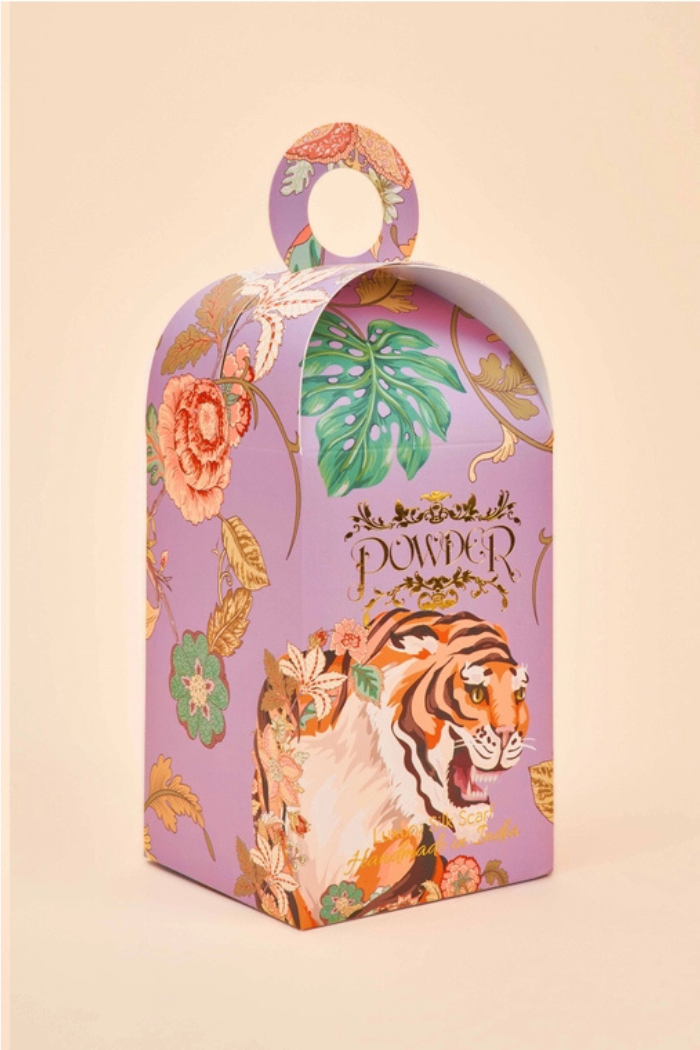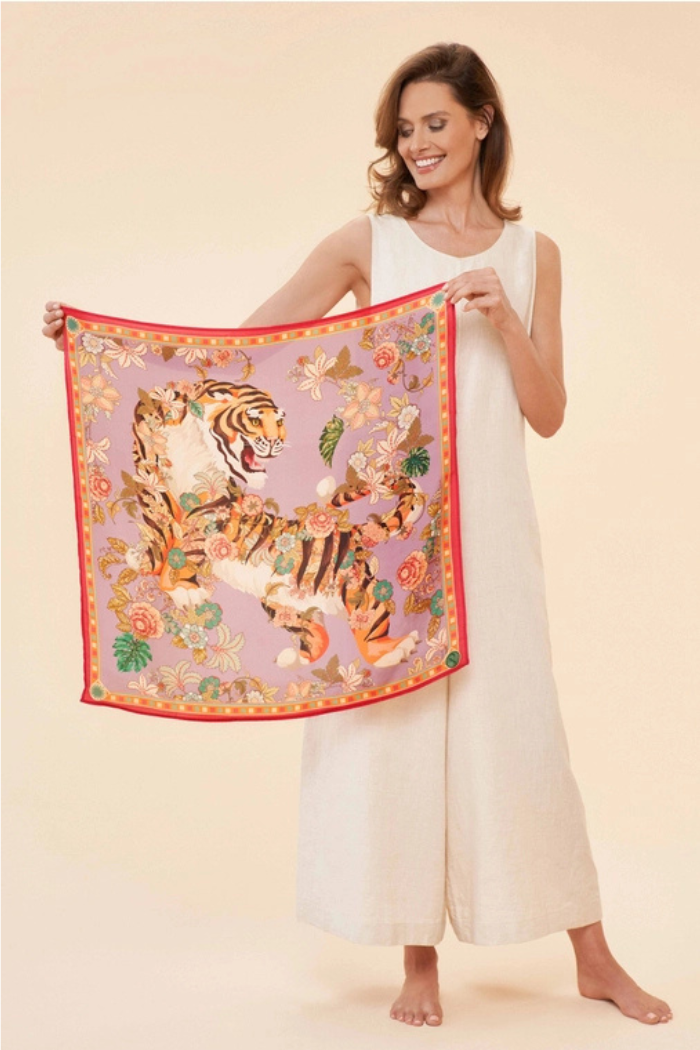 Drawing inspiration from tapestries, our Prancing Tiger design is ideal for those who appreciate intricate details and everyday luxuries! Soft pastel tones paired with florals will elevate any capsule wardrobe. Style it with jeans and a top for a chic look. Crafted from 100% silk, it arrives in a beautiful, unique gift box—perfect for Mother's Day or as a special treat for yourself or a loved one!