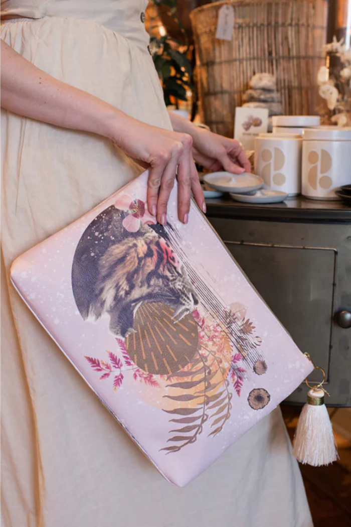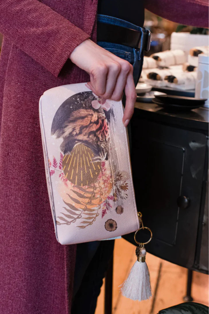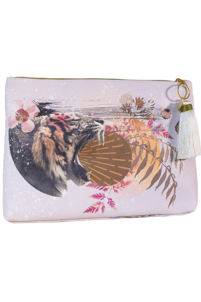 PAPAYA’s Tiger Roar Tassel Pouches are bold and stylish women’s clutches featuring a vibrant floral tiger design with pressed leaves. Perfect for organizing beauty products, cosmetics, toiletries, art supplies, or overnight essentials, these pouches also make a glamorous accessory for a night out. A unique and boho gift ideal for bridal showers, weddings, office parties, birthdays, Mother's Day, and more.