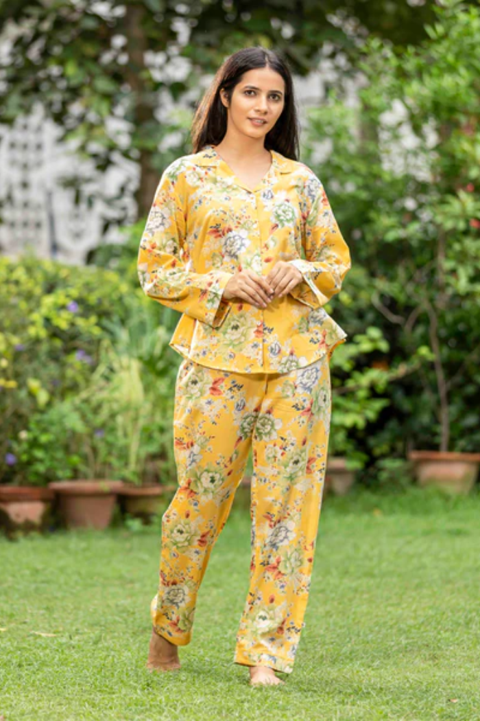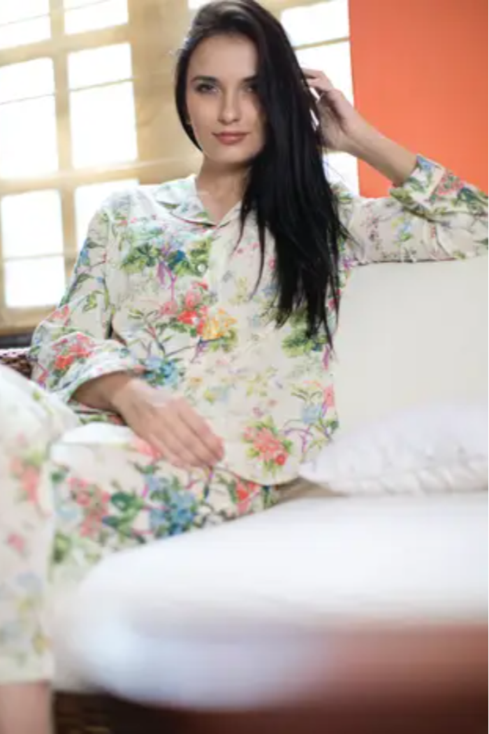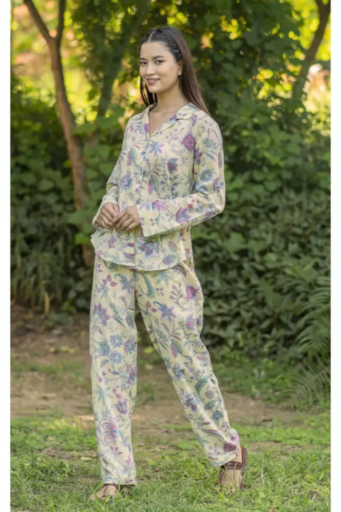 100% Cotton Voile Floral print top & pants Hand printed in India Contemporary and Colorful Available in S, M, L, XL, Matching Kimono available.
