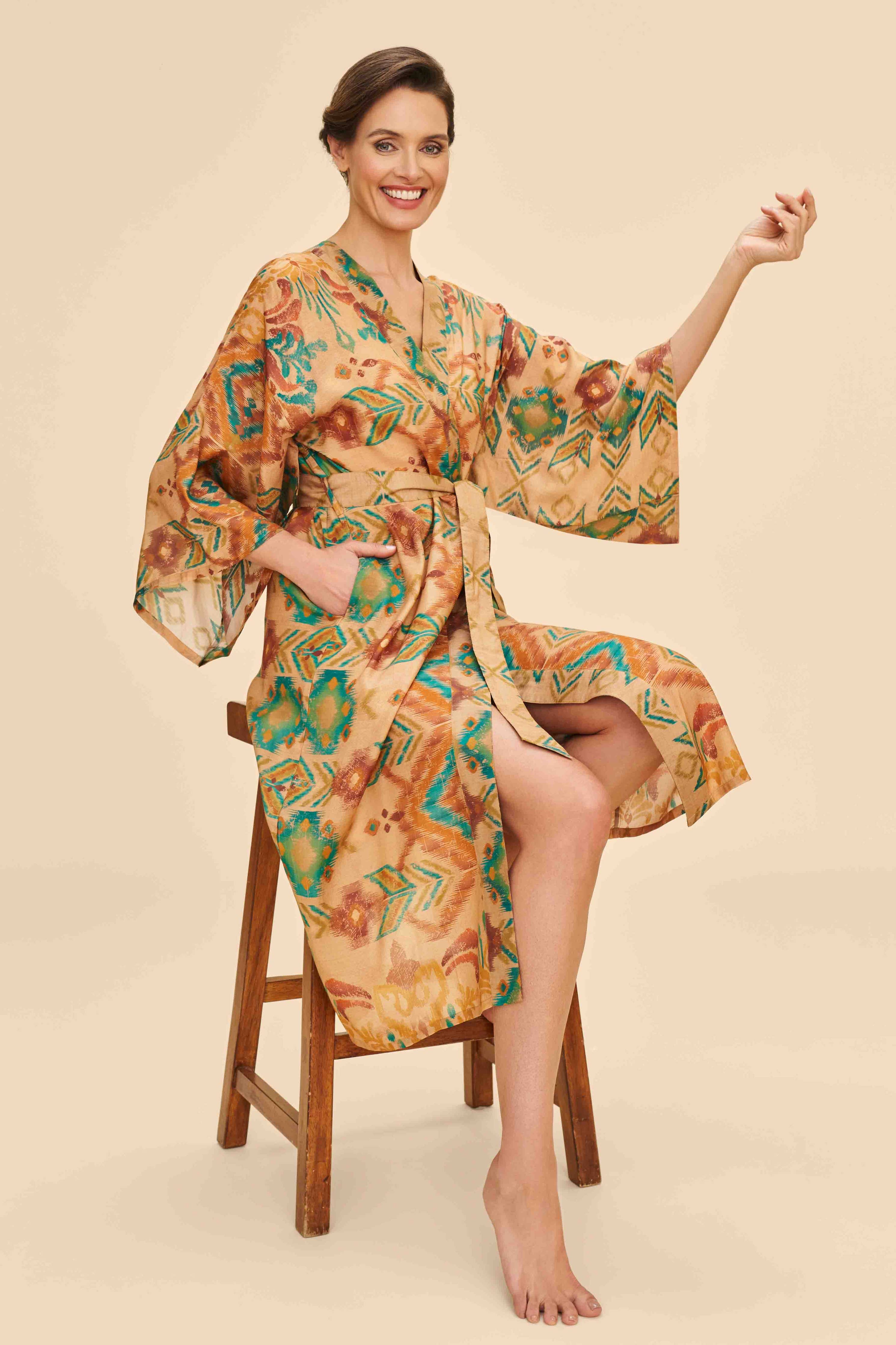 Introducing our ikat kimono jacket design in warm cream! Inspired by traditional dyeing methods and vintage colourways, this fabulously unique print adds an exotic look to any outfit. Wear with jeans and a top for the ideal coverup. Comes with fabulous complimentary packaging. Go on, treat yourself!
